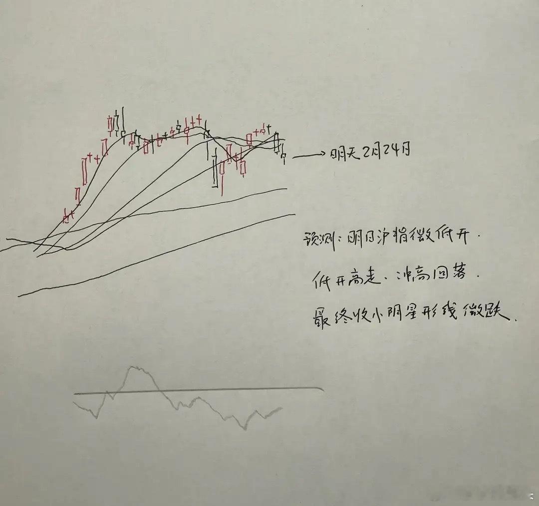 所以综合以上分析,对于明天市场走势,莎哥的观点是明天上证指数低开震荡,最终小幅度微跌的可能性是比较大的。那么明天A股到底怎么走?大家请看图四关于明天走势的手绘预测图: