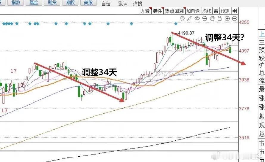 第二, A股自近期低点4002点反弹以来,出现了典型的反弹缩量的情况,这种反弹缩量的情况,属于典型的量能背离结构。量能背离结构,也是导致节前最后一个交易日,最终出现明显调整的主要原因。而当前成交量出现阶段性的持续萎缩,意味着市场的调整可能还并没有结束。从时间周期来看,上一个调整波段,调整延续的时间持续了34个交易日大家看图二。预计这一次调整的时间窗口也会接近34个交易日。