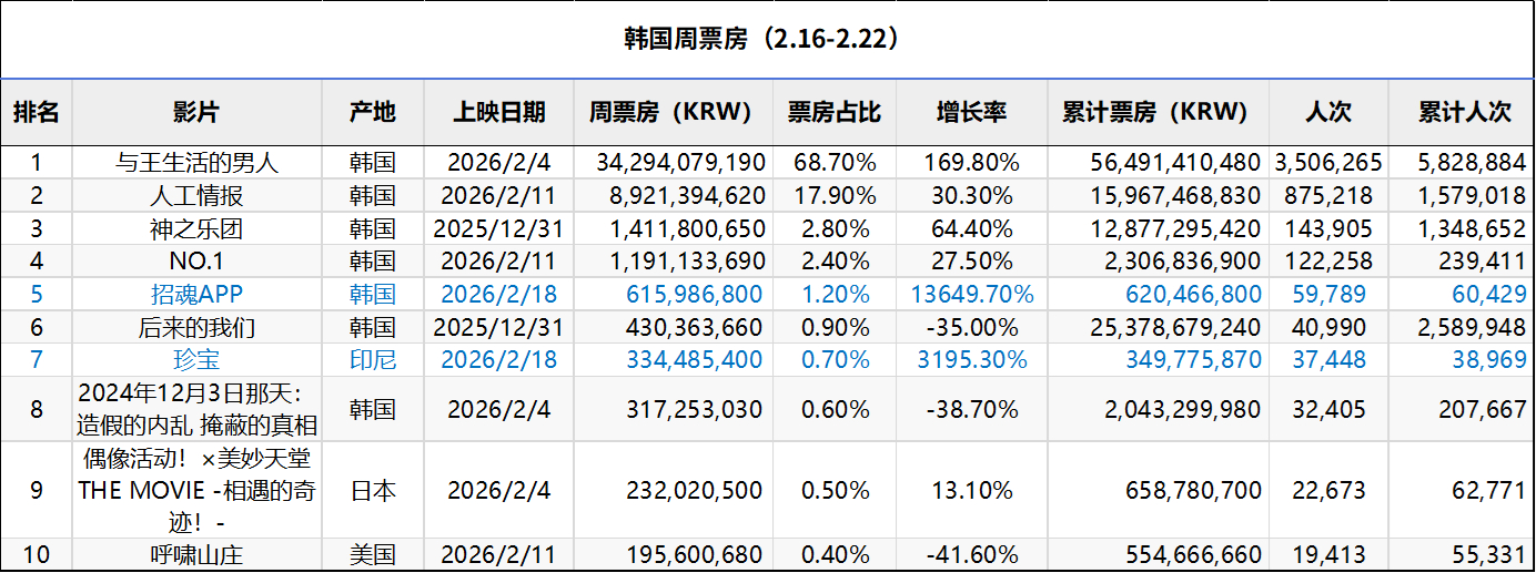 2026年第8周韩国票房 :1. 在春节假期的刺激下各片均有增幅,尤以《与王生活的男人》增长率最高,单周吸纳观影人次350万,累计人次582万,韩国电影今年的开局还算不错;2. 恐怖片《招魂APP》在新片中表现最佳。(数据:韩国电影振兴委员会)