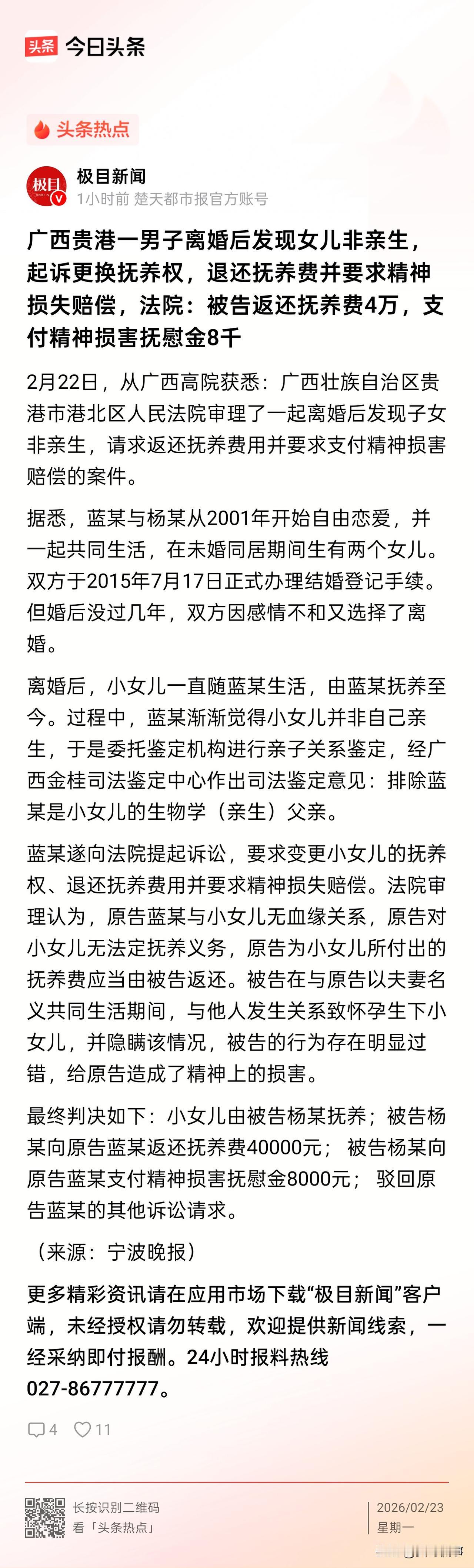 广西,一男子在未领证的情况下,与女友以夫妻名义同居了14年,并生下两个女儿。后来,男子和女友领证成为合法夫妻,可好景不长,没过几年他们就离了婚。离婚后,男子愈发觉得小女儿长得不像自己,便又去做了亲子鉴定,果不其然,小女儿和男子完全没有血缘关系。男子愤怒不已,遂将前妻告上法院要求返还抚养费,法院判了! 2001年,蓝先生和杨某因自由恋爱走到了一起,两人没有繁琐的仪式,甚至没有领证,便以夫妻名义同居。 在两人同居期间,两个女儿相继出生,让这个小家充满了烟火气。当然,蓝先生为了这个家庭,也一直在辛苦打拼。 到了2015年,两人正式登记结婚。 可婚后的矛盾与争吵,却让两人曾经的温情荡然无存,没过几年,两人便离了婚。 离婚后,小女儿一直由蓝先生抚养,包揽起了孩子的衣食住行,为此倾注了无数心血。 可随着孩子长大,蓝先生越发觉得不对劲:孩子的长相、神态与自己毫无相似之处。 为了打消内心的疑虑,蓝先生决定去鉴定中心做亲子鉴定。 然而,鉴定结果却让蓝先生大失所望:排除蓝先生是小女儿的生物学父亲。 他这才明白,自己多年的倾心养育,不过是替他人做“嫁衣裳”。 愤怒与心寒之下,蓝先生一纸诉状将杨某诉至法院,要求变更抚养权、返还抚养费,并索赔精神损失。 法院审理后明确,蓝先生与孩子无血缘关系,他本人也就无法定抚养义务。 而杨某在同居期间与他人生育子女并长期隐瞒,存在重大过错,严重侵害了蓝先生的人格尊严与情感权益。 最终,法院判决小女儿由杨某抚养;杨某返还蓝先生抚养费40000元,支付精神损害抚慰金8000元。 这件事在网上传开后,立刻引发了网友们的激烈讨论。 有人心疼蓝先生:“真心喂了狗,十几年的付出换来一场欺骗,换谁都会崩溃”; 也有人怒斥杨某:“婚姻最基本的就是忠诚,瞒着丈夫养别人的孩子,太缺德了”; 也有人无奈感叹:“最可怜的还是孩子,明明什么都没做,却要承受大人的过错带来的后果”。 是啊,从蓝先生与杨某相爱同居到结婚离婚,从倾心养女到发现真相,他的经历戳中了无数人对婚姻与亲情的思考。 婚姻的基石是忠诚与信任,刻意的隐瞒与欺骗,终究会毁掉所有的感情与付出。 而这场错位的父爱,既伤了付出真心的人,也让无辜的孩子陷入尴尬的境地。 常言道,相爱容易相守难,比不爱更伤人的,是长达十几年的欺骗。 蓝先生用半生付出,换来一纸冰冷的鉴定,这场错位的父爱和失败的婚姻,也给所有人提了醒: 婚姻里可以没有轰轰烈烈,但绝对不能没有坦诚;亲情里可以没有血缘,但绝对不能建立在谎言之上。 对此,你怎么看?欢迎大家在评论区留言。