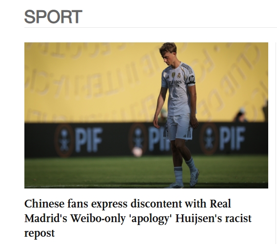 皇马球员迪恩·赫伊森在Instagram上转发了一则包含针对中国人和亚洲人种族歧视言论的内容,随后又发布道歉声明。但皇马俱乐部在新浪微博上发布的相关声明却引发了中国球迷的强烈不满,他们批评这份道歉缺乏诚意,并指责俱乐部采取双重标准,因为无论是在皇马的海外官方平台,还是赫伊森本人的账号上,都未见任何声明。