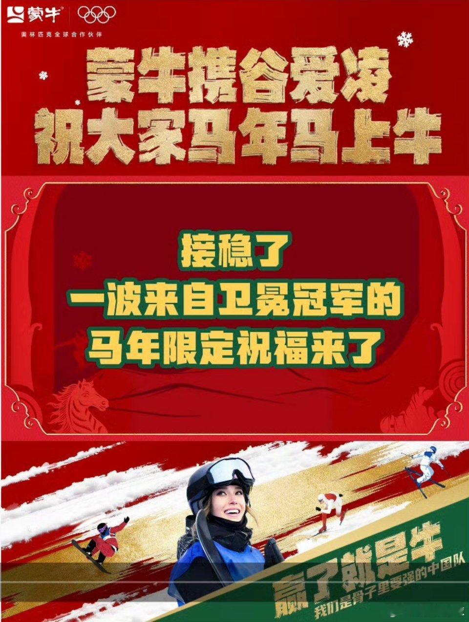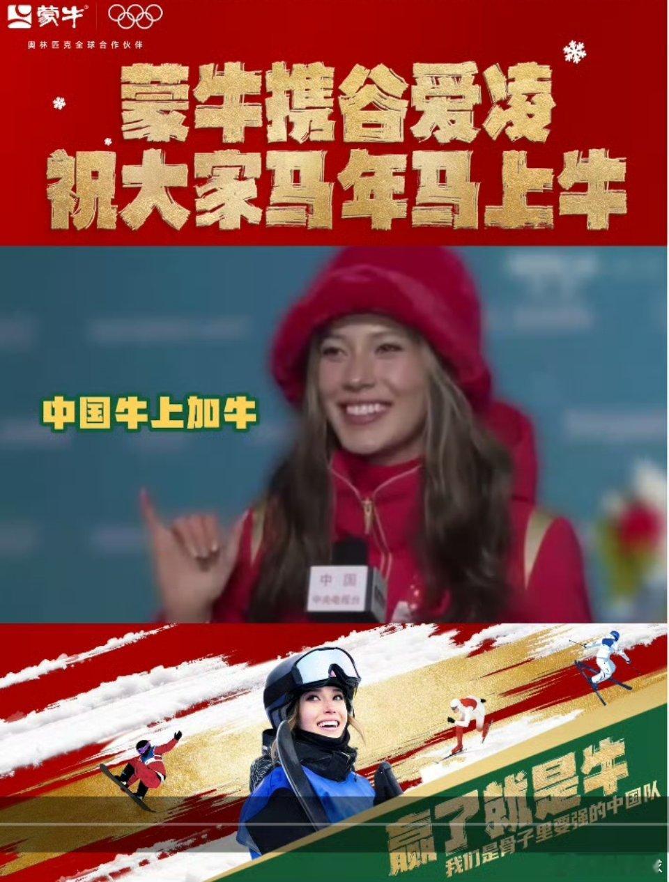 谷爱凌马上牛好灵两届冬奥,3金3银,100%夺牌率!谷爱凌的完美表现,再次诠释了什么是“刻在骨子里的要强”。每一次精准入弯,每一回腾空定格,没有侥幸,全是日复一日的打磨与全力以赴。马年新春,蒙牛携手谷爱凌给各位送上硬核的新年祝福!愿大家拥有如谷爱凌般的要强底气,也有一往无前的马年冲劲。新的一年,事业牛、身体牛、运气牛,万事顺遂!