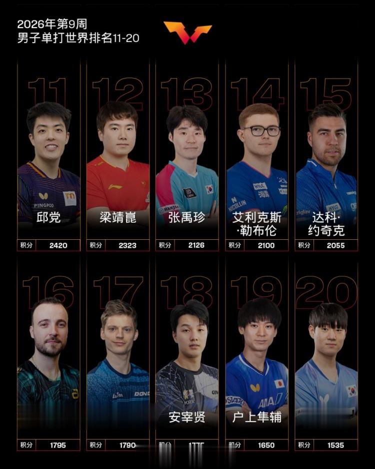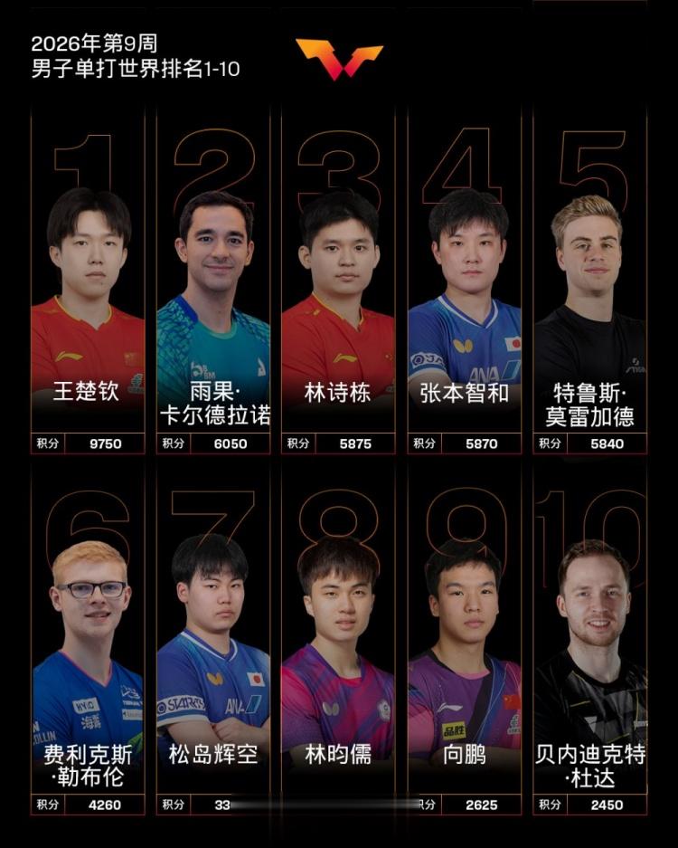 直播吧2月23日讯今日,国际乒联公布了2026年第9周男子单打世界排名,中国选手王楚钦继续位列榜首,林诗栋排在第3位,向鹏第9位。