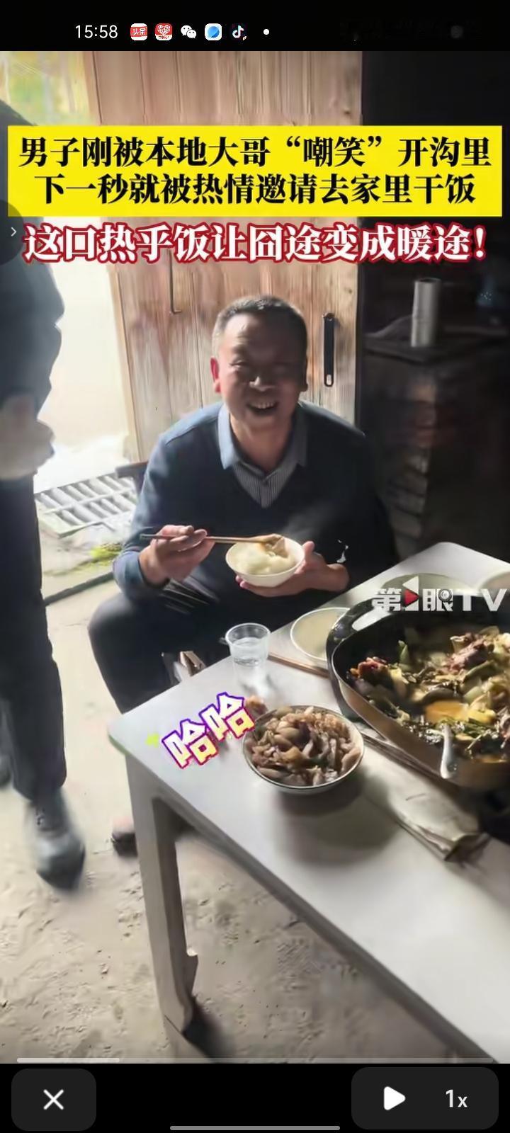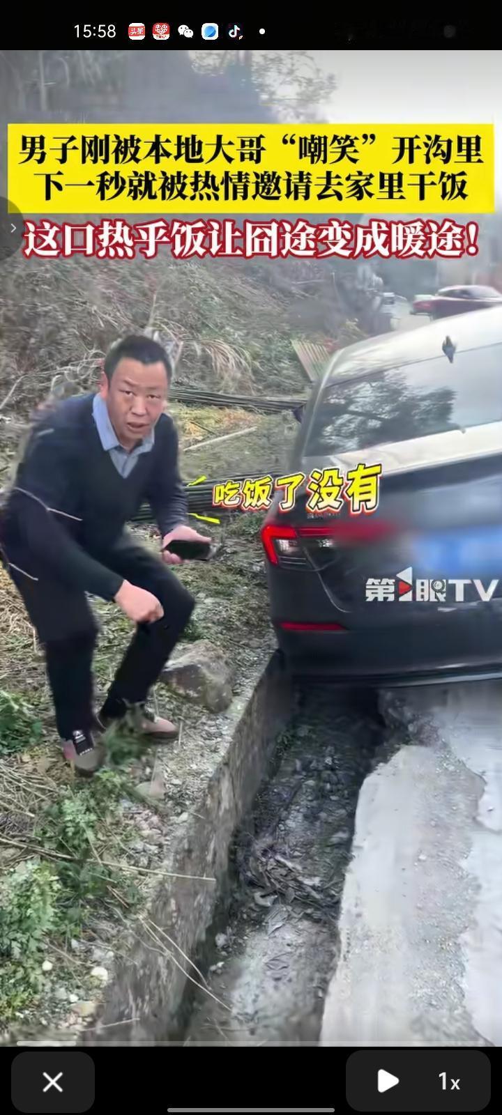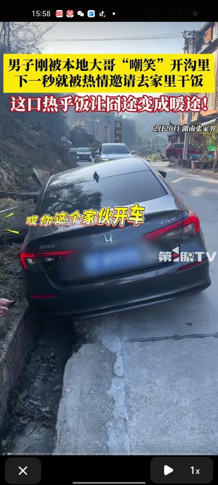 2月20日,湖南张家界。网友发视频称,自己和家里人聊天时听见“砰”的一声,跑出去一看,是车主把车开进沟里了。见他没吃饭,就邀请其去家里吃饭,还帮其联系救援车。吃完饭后,救援车把车弄出来了。