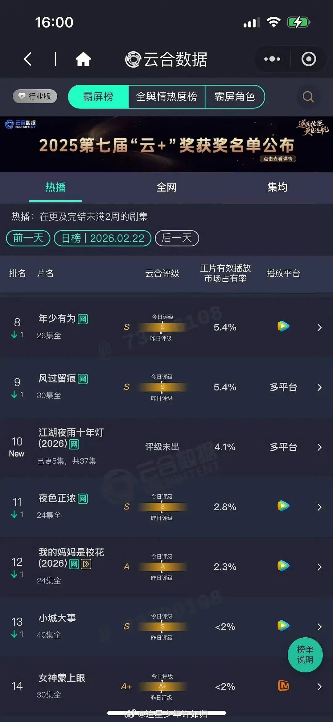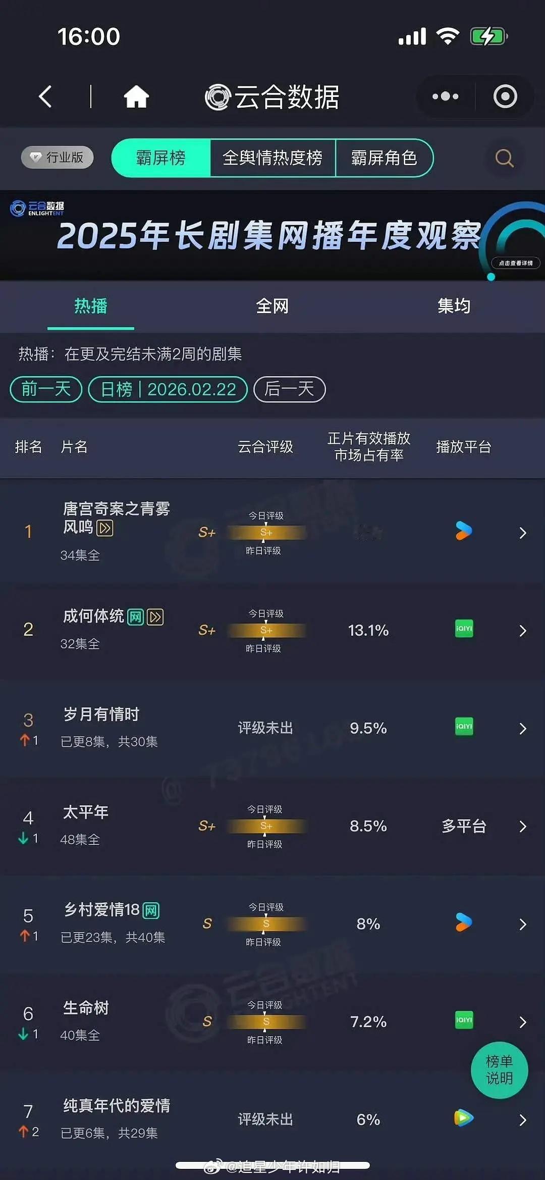 昨日云合数据已出:唐宫奇案超点 2400w+岁月有情时 1300w+ 纯真年代的爱情 次日 800w+ 江湖夜雨十年灯 首日 600w+ 唐宫超点都没有大涨,打响 2000 保卫战其实看灯塔的排名和云合差不多,除了👖的剧灯塔会给不少数据…其他平台也不错的。