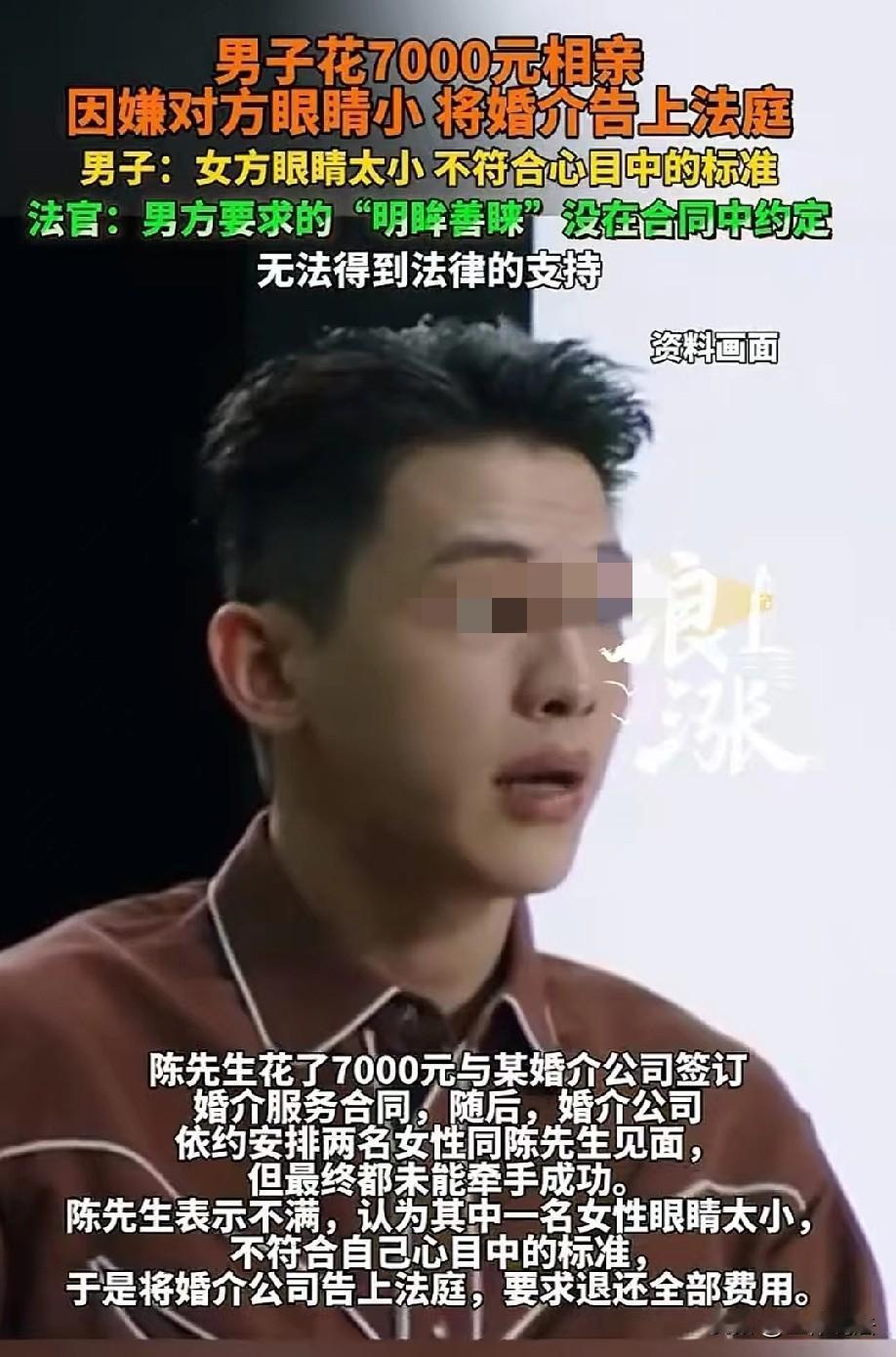 找不到对象是有原因的!广东广州,男子一把年纪找不到对象,便咬咬牙花7000元找了一家婚介公司,希望尽快给他找到心仪的另一半。但婚介公司前后给他介绍了两个,他都没有牵手成功。男子表示,自己要找的对象是大眼睛双眼皮的,但公司给他找的眼睛太小,根本不符合自己的择偶标准。于是,他把婚介公司告上法庭,要求全额退款。网友:太奇葩了,你找不到对象是有原因的! 陈先生年纪不小了,却一直没能找到合适的对象,看着同龄人成双入对,一家三口其乐融融,越发着急。 于是,他咬咬牙找了一家中介公司,花了7000块钱,希望能尽快给他找到心仪的另一半。 陈先生虽然着急,但他对未来另一半的要求可不低,对方必须是明眸皓齿,大眼睛双眼皮,性格温柔,善解人意,上得厅堂下得厨房。 他觉得,只有这样完美的女性,才配得上自己。 签完合同,他把自己的这些要求一股脑儿地告诉了婚介公司,还一个劲儿地催促,希望尽快给他物色合适人选。 很快,婚介公司就行动起来,先后给陈先生介绍了两个相亲对象。 陈先生每次都精心打扮,怀揣着激动的心情去见面,可两次见面后,他都失望透顶。 因为,对方都不太符合自己的标准,自然也就没有牵手成功。 尤其是其中一个相亲对象,一见面他就皱起了眉头,对方眼睛也太小了,快眯成一条缝了,跟他心目中明眸皓齿的标准差太远了。 他觉得,自己相亲不成功都怪婚介公司,他们根本没把自己的要求当回事,态度敷衍,没有严格按照标准来筛选人,白白浪费了自己的时间和精力。 他越想越气,可不想让自己的钱白花,于是,竟把婚介公司告上法庭,要求他们退还全部费用。 婚介公司这边是一肚子委屈,他们表示,合同义务仅仅是按照约定的条件给陈先生介绍相亲对象,从来都没有承诺过包成功,也没保证过一定能建立恋爱关系。 但陈先生坚持认为,之前那个女生眼睛太小,完全不符合自己的择偶标准,必须退钱。 法院审理认为,陈先生要求的“明眸善睐”这种标准,在合同里根本就没有明确约定。 而且,这种标准也太模糊、太不具体了,从法律上根本没办法支持他的诉求。 最终,法院认为婚介公司已经按照合同履行了义务,驳回了陈先生的诉讼请求。 这陈先生一把年纪,对另一半的要求如此苛刻又奇葩,眼睛大小这种细节都要严格把控,真是以貌取人。 好的感情,是需要慢慢培养和磨合的,光看脸蛋,很难找到踏踏实实的结婚对象。 也难怪,他这么大年龄还没找到对象,要是一直抱着这种不切实际的标准,恐怕以后只会更难。 《民法典》第五百一十一条规定:当事人就有关合同内容约定不明确,依据前条规定仍不能确定的,适用下列规定: (一)质量要求不明确的,按照强制性国家标准履行;没有强制性国家标准的,按照推荐性国家标准履行;没有推荐性国家标准的,按照行业标准履行;没有国家标准、行业标准的,按照通常标准或者符合合同目的的特定标准履行 。 陈先生与婚介公司的服务合同中,未将“明眸皓齿、大眼睛双眼皮”等外貌标准明确写入合同。 他仅口头提出的模糊、主观化要求,属于合同履行标准约定不明,无法通过补充协议或交易习惯确定具体判定尺度。 婚介服务的质量应按行业通常标准认定,即按一般择偶条件提供匹配、安排见面,公司已实际介绍两位对象并完成约见,已履行合同主要义务,不存在违约。 陈先生以“眼睛太小不符合标准”主张退款,本质是将个人主观审美强加为合同法定标准,而法律不认可此类无法量化、无统一判定依据的模糊要求。 感情这事最忌太自我、太挑剔,只看外表不踏实相处,就算介绍再多,也很难找到真相过日子的人。