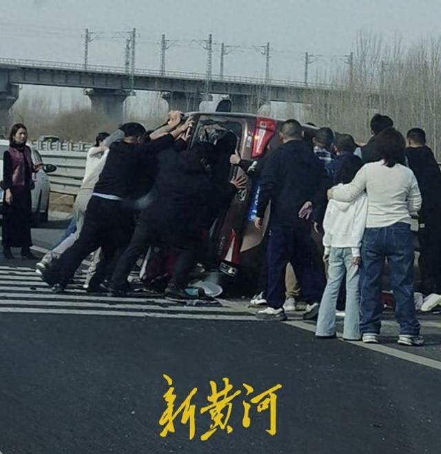 现场目击者张女士向新黄河记者回忆道,当时一辆机动车因紧急刹车失控,连续翻滚后侧翻在路面,车窗玻璃全被撞碎、车内人员被困,情况十分危急。就在事故刚发生后,十几辆途经此处的车辆不约而同打开双闪,稳稳停在应急车道上,上前解救被困人员,“一开始还以为是有人打架了,离近了才发现是大家在帮忙解救失控车辆内的人员,好在车内的人没受什么伤,这些施救者的行为充满正能量,我看到也觉得十分感动。”
