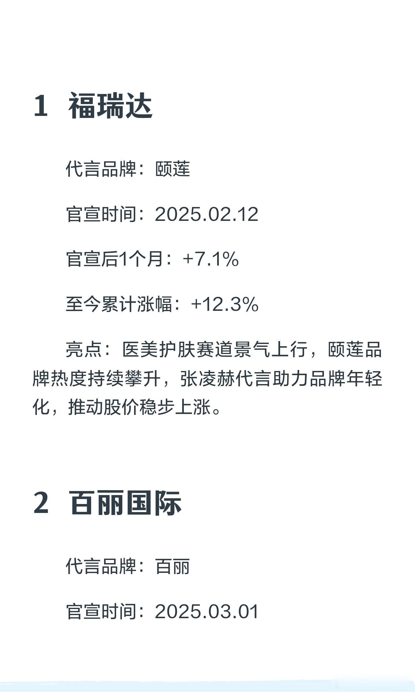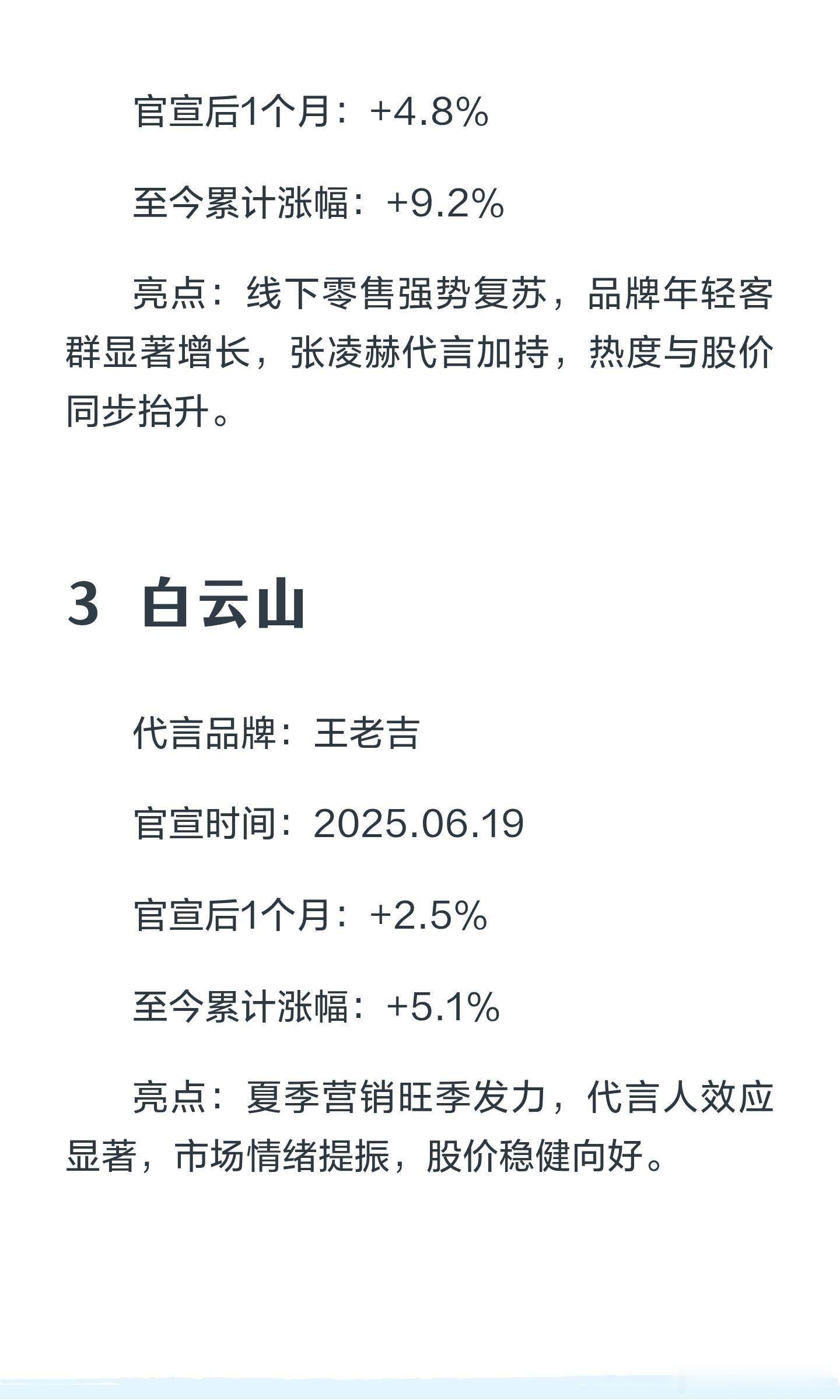 张凌赫代言助力多品牌股价上涨,颐莲、百丽、王老吉、嘉美包装等品牌在官宣后1个月内股价涨幅显著,累计涨幅分别为12.3%、9.2%、5.1%和18.7%,彰显其在医美护肤、零售、饮品及包装领域的强劲表现。