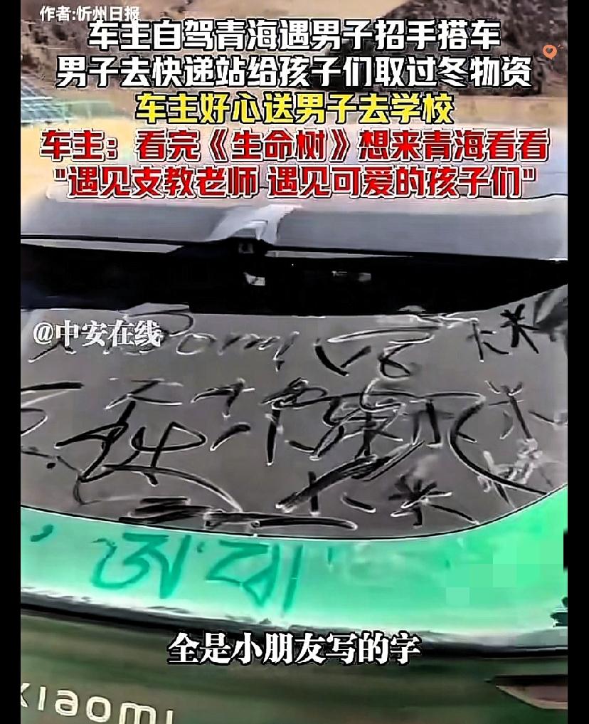 青海零下17℃的暖心一幕,看完直接破防! 男子自驾途中遇到陌生人搭车,对方主动出示身份证,诚恳又朴实。他好心搭载,才知道对方是支教老师,要去给孩子们取过冬的衣服。 他二话不说,全程护送,把满满一后备箱温暖送到学校。 临走时他发现,车身被孩子们写满了稚嫩的字迹,画着小太阳和小花。 老师连连道歉,可男子却笑着说,这不是脏,是最珍贵的礼物。 他本是来看风景,却遇见了比风景更动人的人心。 支教老师默默坚守,孩子们纯真感恩,陌生人伸手相助,善意环环相扣,暖透了整个寒冬。 最好的旅行,从来不是打卡美景,而是把温柔留给路上遇见的人。 你被这份高原上的温暖治愈了吗?