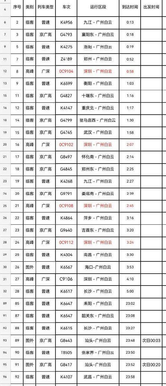 据悉,在春运等客流极端高峰时,铁路部门会临时加开夜间高铁(也称“红眼高铁”)来输送旅客。根据铁路部门通报,为满足旅客的需求,广州白云站等铁路车站计划从2月21日(正月初五)至3月7日(正月十九)加开夜间高铁列车(0:00-6:00),共15天。其中,广州白云站始发列车4至30趟,途经列车1至7趟,终到列车1至29趟。