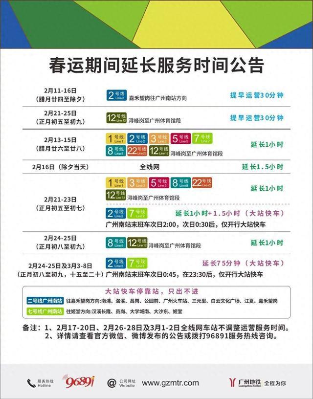 为对接夜间列车客流,广州地铁有针对性地调整运营方案:2月21日至25日(正月初五至初九)返程高峰,服务广州白云站的十二号线西段、八号线延长运营1小时,十二号线西段同时提早30分钟发车。其中,十二号线(广州白云站直达线)常规下行末班车23:48(往浔峰岗方向)途经聚龙(可换乘八号线),常规上行末班车23:10(往广州体育馆方向)途经新市墟(可换乘十四号线)、白云文化广场(可换乘二号线)等换乘站点;二号线可到广州火车站、广州南站,二号线到公园前地铁站可换乘一号线,通达全城;一号线广州东站往西塱方向末班车最晚至00:00。高峰时段,各线路通过增开列车、缩短间隔提升运力,保障客流快速疏散。