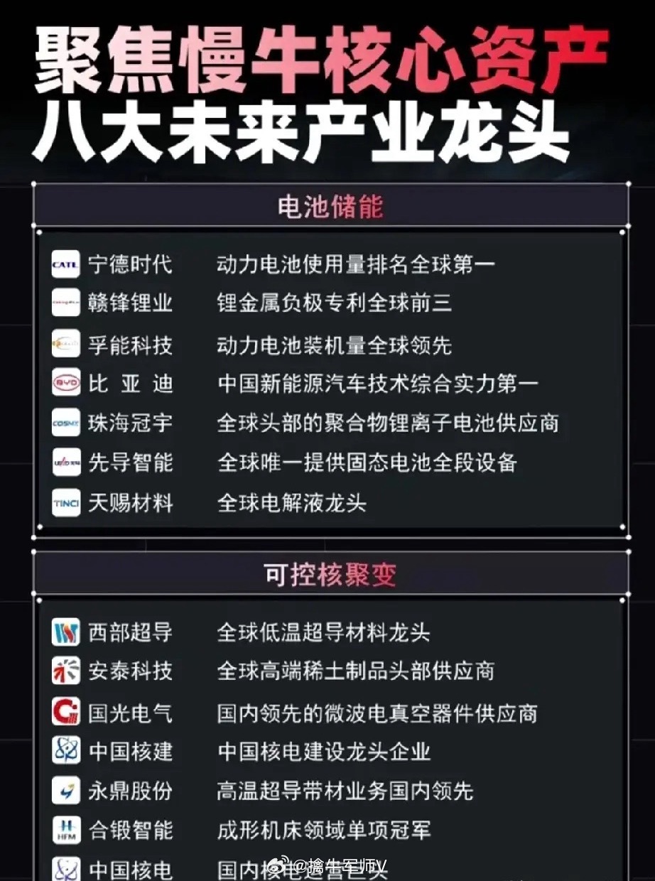 锁定慢牛核心资产,八大未来产业龙头全梳理!A股慢牛行情已启,未来产业主线清晰!半导体、商业航天、机器人、电池储能、可控核聚变、消费电子、算力、量子科技八大黄金赛道,龙头企业名单已整理完毕,每一家都是细分领域的绝对王者,是把握时代红利的关键抓手!相关概念龙头代表有哪些?半导体概念:国产替代加速,全产业链龙头领航。半导体是科技自立自强的核心赛道,国产替代浪潮下,概念核心龙头值得关注:寒武纪、南大光电……