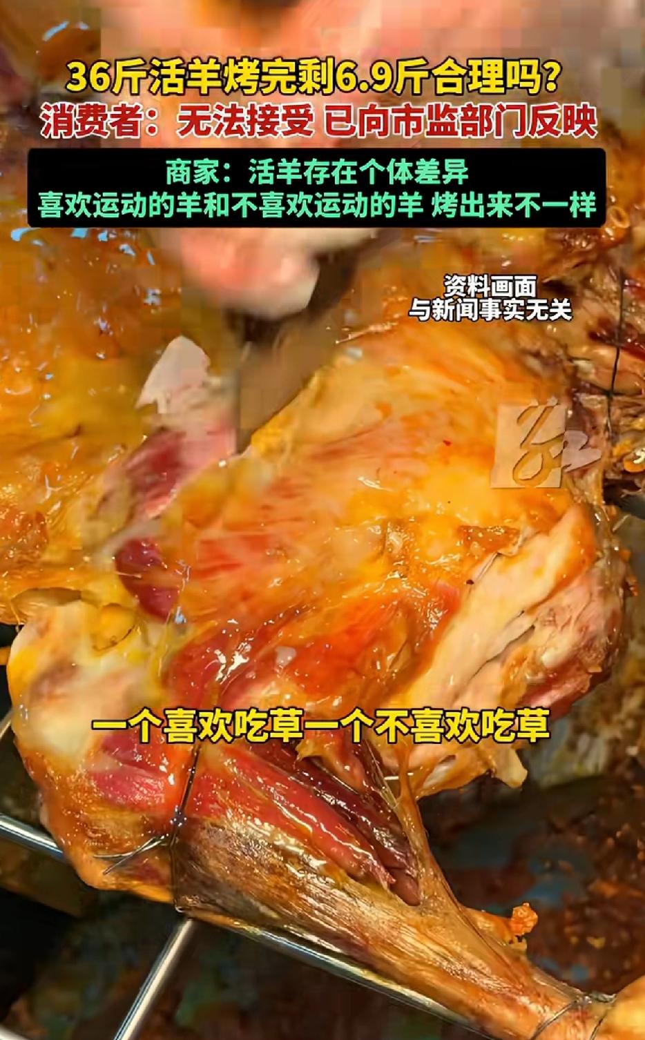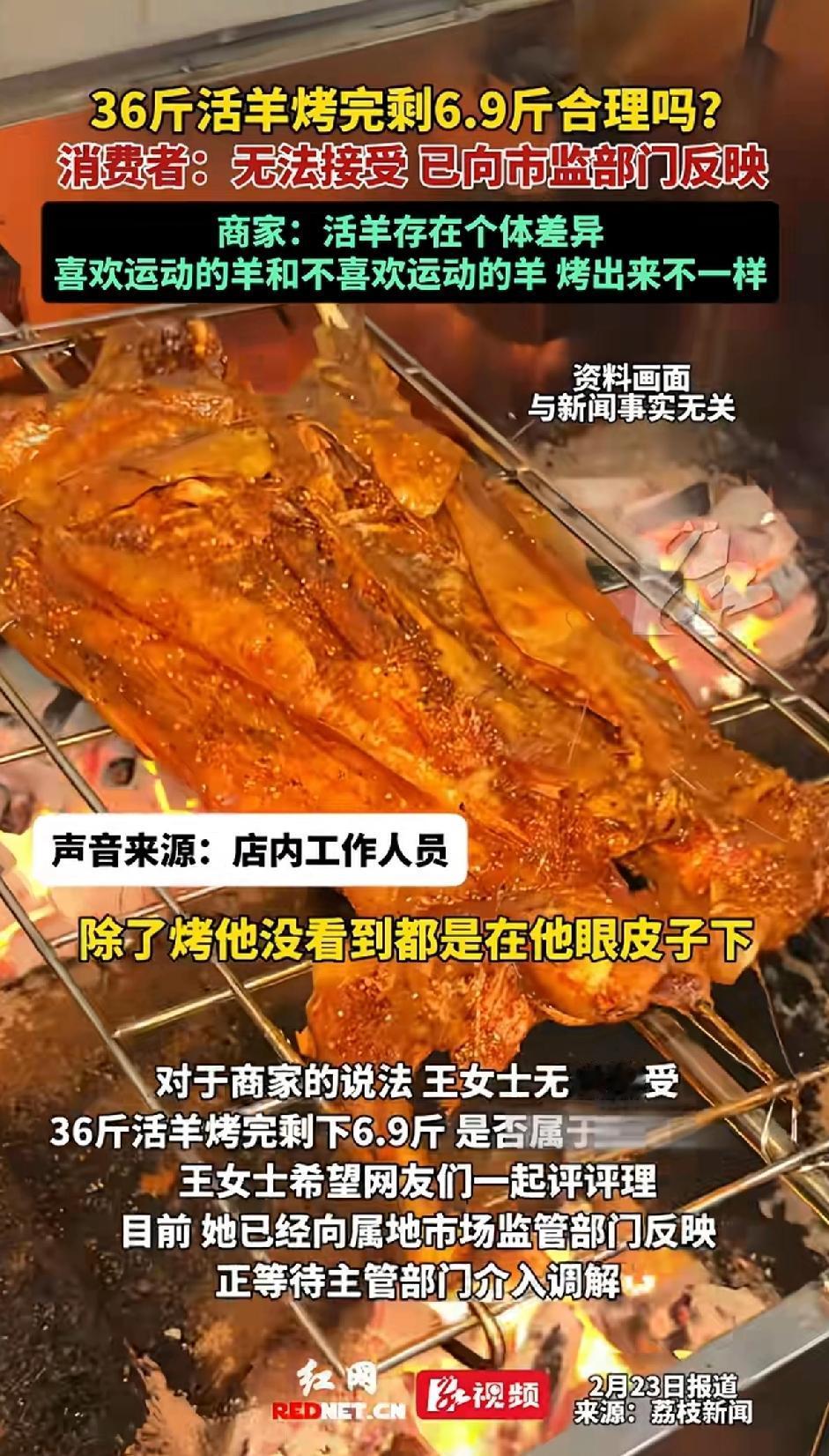 36斤活羊烤完剩6.9斤合理吗? 老板娘给出的解释:有的羊喜欢运动,有的羊不喜欢运动。有的羊喜欢吃草,有的羊不喜欢吃草一样。至于烤出来有多少,活羊存在个体差异。 这事儿乍一听真让人惊掉下巴!重庆王女士一家除夕夜就碰上这闹心事,花1188元买的套餐,活羊称36斤,端上桌的却小得可怜。商家先说正常损耗,又扯什么羊爱不爱运动。又说一切都是正常操作,就在消费者眼皮子底下操作的。 消费者:无法接受,已经向是监管部门反映。大过年碰到这样的事确实很闹心,本来高高兴兴出来吃饭,碰到这样损耗确实让王女士很无语。 按行业标准,36斤活羊去杂后至少剩16 - 18斤,烤完起码10斤以上,这6.9斤确实少得离谱,很难不让人怀疑商家动了手脚。 不过,也有专业数据显示理论上烤完剩9斤上下算合理,6.9斤虽偏低但也不算完全没可能。只能说商家要是提前说明烤制后缩水情况,也不会引发这么大争议。 消费者。 没吃过烤全羊,只吃过羊排和羊肉串,36斤的活羊烤过后缩水至6.9斤,着实很意外。至于损耗是否正常,应该让内蒙和新疆的网友看到这条新闻,让他们来评价这样的损耗是否合理。 没有烤全羊经验的网友只能作为旁观者看看热闹,这样的闹剧到底怎么收场,也要看有关部门给出合理答案。