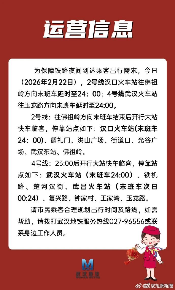 【#武汉地铁2条线初七延时至24点#】为保障铁路夜间到达乘客出行需求,今日(2026年2月23日),武汉地铁2号线、4号线延时运营、加开“大站快车”临客。2号线汉口火车站往佛祖岭方向末班车延时至24:00,4号线武汉火车站往玉龙路方向末班车延时至24:00。