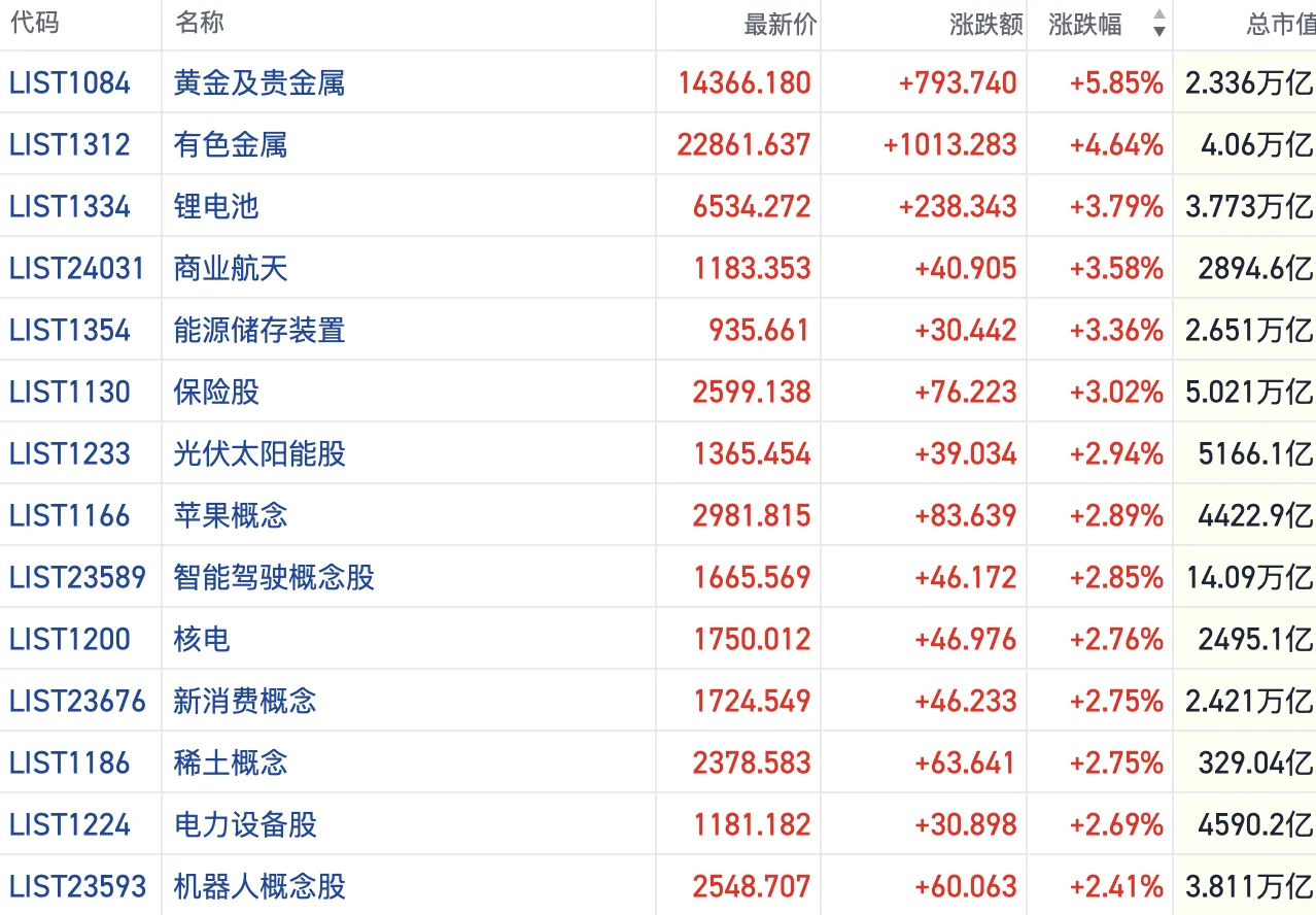 其他方向上,AI主线短线分化,算力硬件方向走强。此外,黄金有色、锂电、汽车股涨幅居前。下跌的板块中,仅纸业、旅游及部分消费股走跌。
