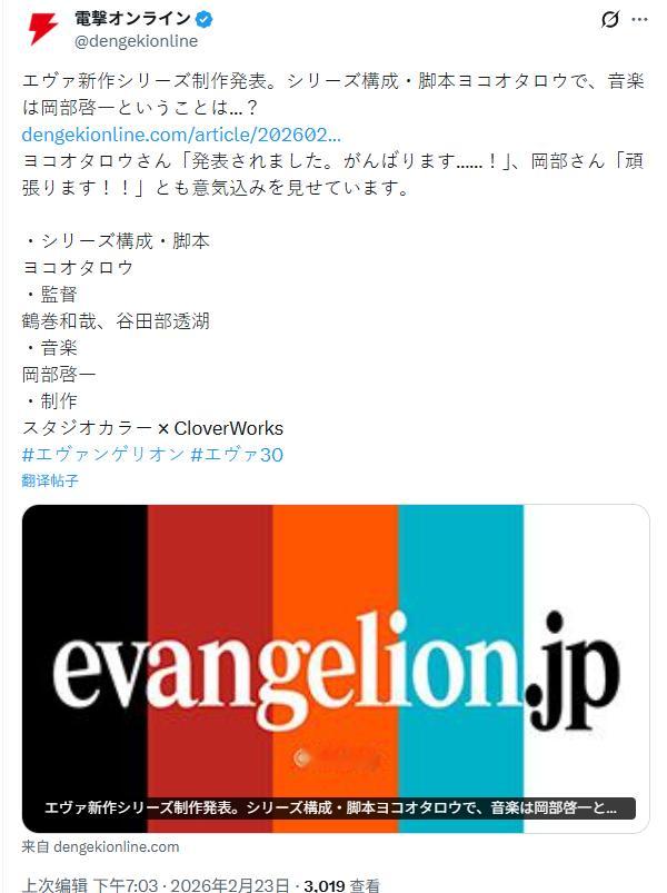 eva 《新世纪福音战士》系列新作正式官宣!!新导演不是庵野秀明
