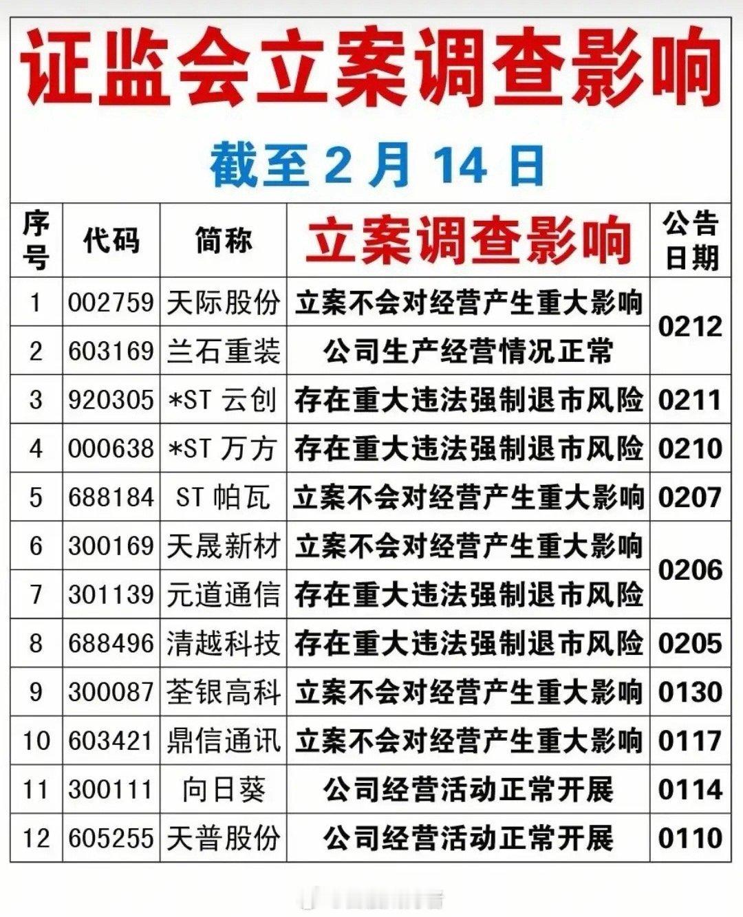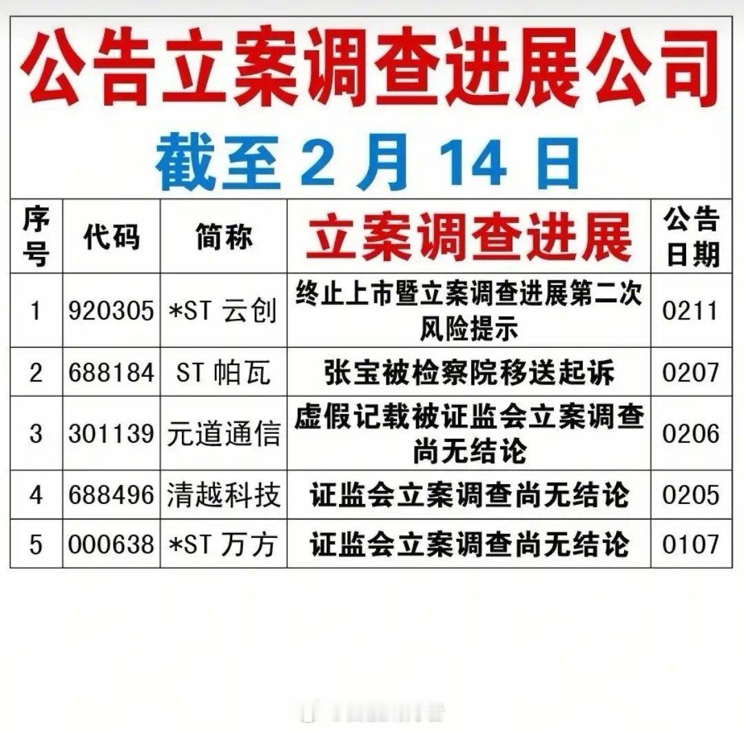2月14日,A股市场监管力度持续加强。截至当天,已有19家公司提示终止上市风险,退市预警全面拉响;多只股票因信息披露违法违规被证监会立案调查,其中*ST云创、*ST万方等多家公司更是存在重大违法强制退市的可能,投资者必须高度重视。