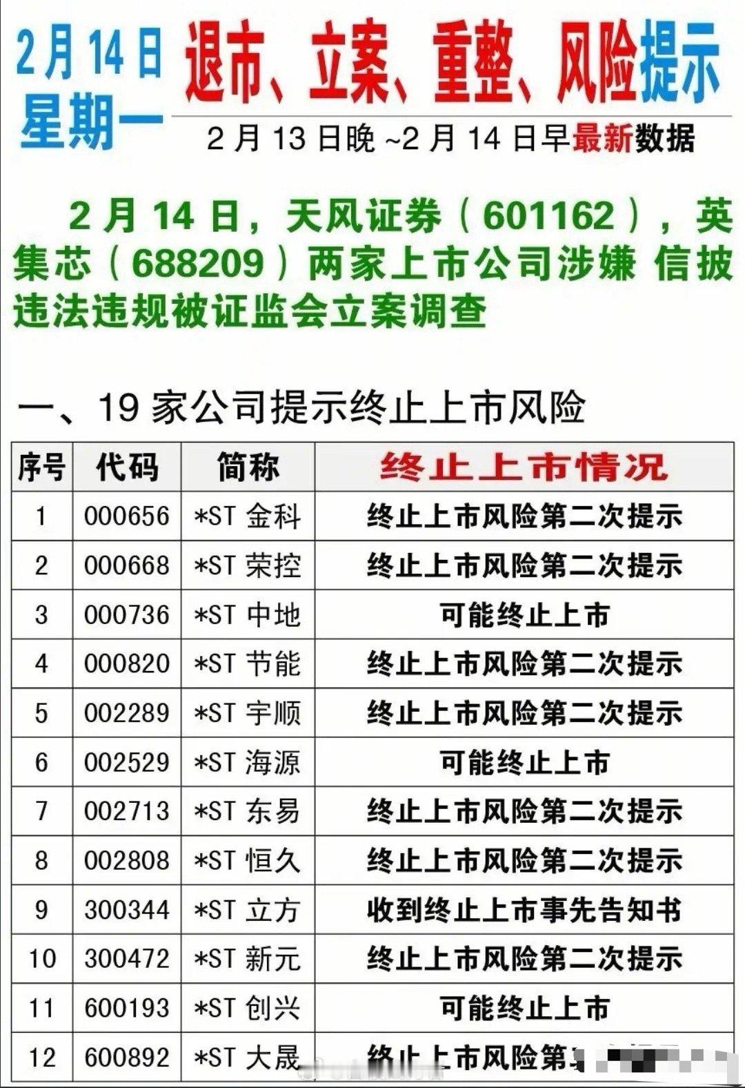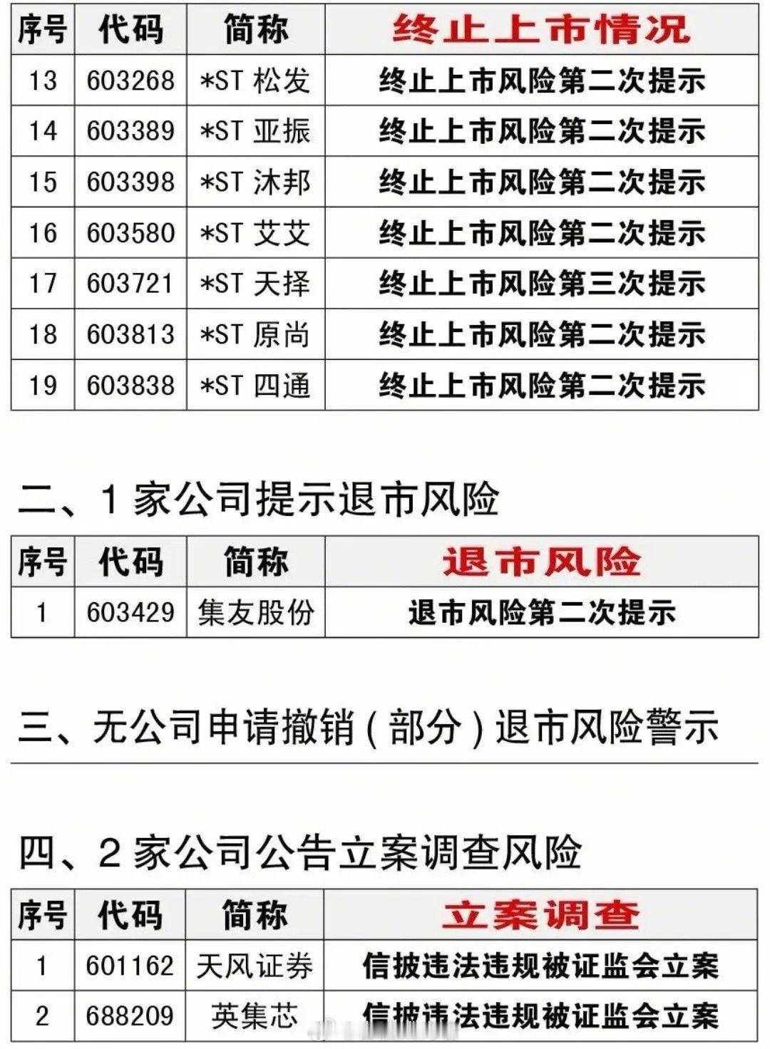 明天开盘需留意风险!A股近期“雷区”曝光,19家公司面临退市风险,立案调查风波持续发酵,散户朋友们要格外警惕,及时规避。祝大家开市顺利,投资顺利!