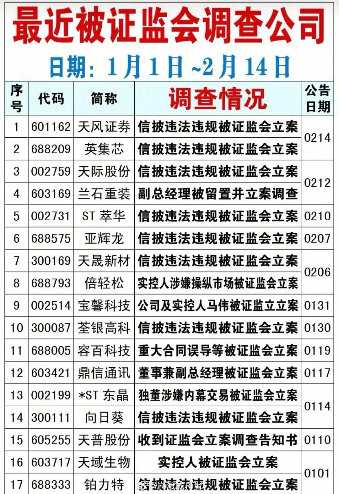 当前市场风险隐患不容忽视,2026年开年以来,被立案调查的公司已达17家,涉及信息披露违规、操纵市场等多种问题。在监管不断趋严的背景下,投资者务必谨慎甄别,远离问题个股,确保本金安全。