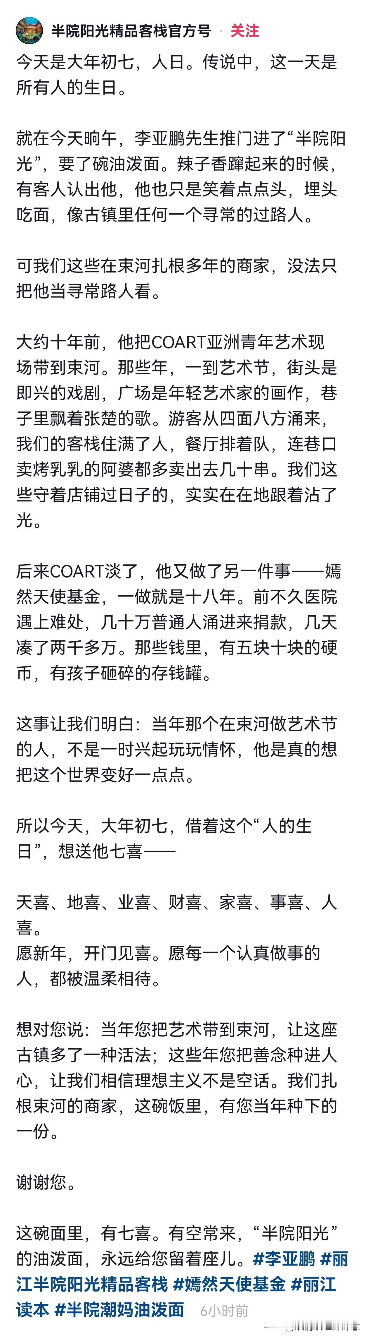大年初七, 李亚鹏现身云南大理束河, 他点了一碗油泼面,商家发长文感谢。 原来,十年前,李亚鹏把COART亚洲青年艺术现场带到束河,让古镇焕发新生,餐馆排长队,客栈住满了人,让这些在束河扎根多年的商家,实实在在跟着沾了光。 这一晃都十年了,没想到李亚鹏还来束河,还是那么低调,就安安静静吃碗面,像古镇里任何一个寻常的路人。 这事让人挺感慨的——有些人,你以为他早过气了,可在另一些人心里,他一直是个恩人。