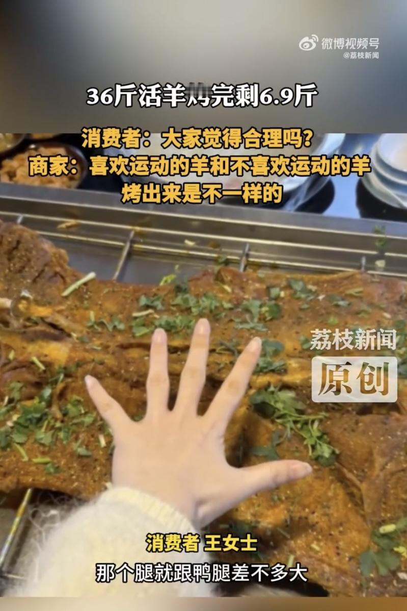 重庆王女士反映,除夕夜在当地一烤全羊店花费1188元购买套餐,店家现场称重活羊36斤,但烤后上桌分量极少。她要求复称遭拒后报警,最终烤羊肉仅重6.9斤。店家以宰杀去内脏、烤制脱水为由解释,王女士不认可,已向市场监管部门投诉求助。