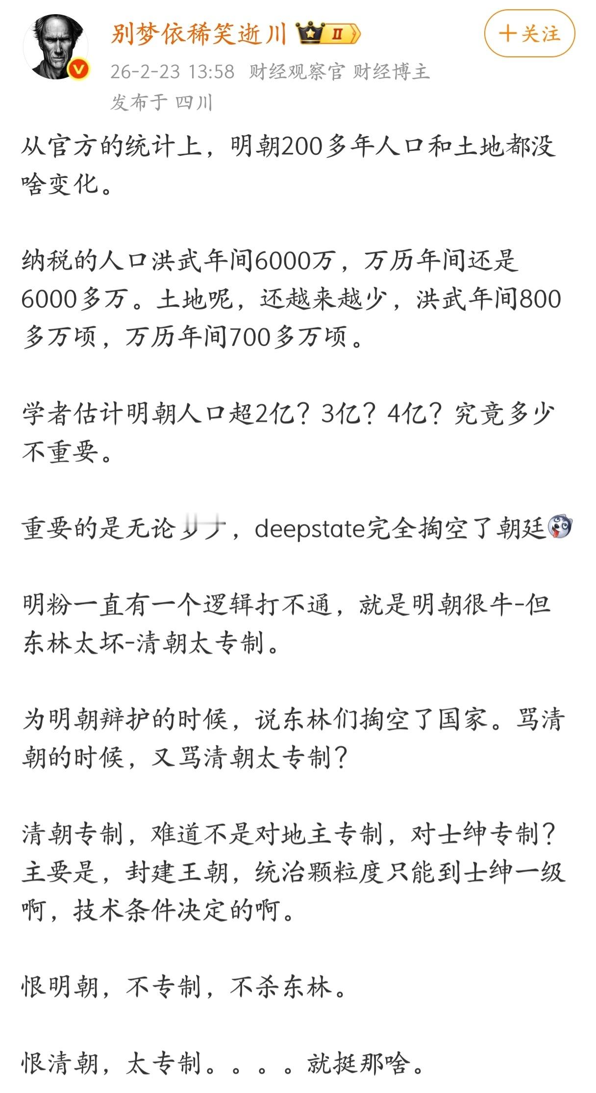 明粉一直有一个逻辑打不通,就是明朝很牛-但东林太坏-清朝太专制。为明朝辩护的时候,说东林们掏空了国家。骂清朝的时候,又骂清朝太专制?