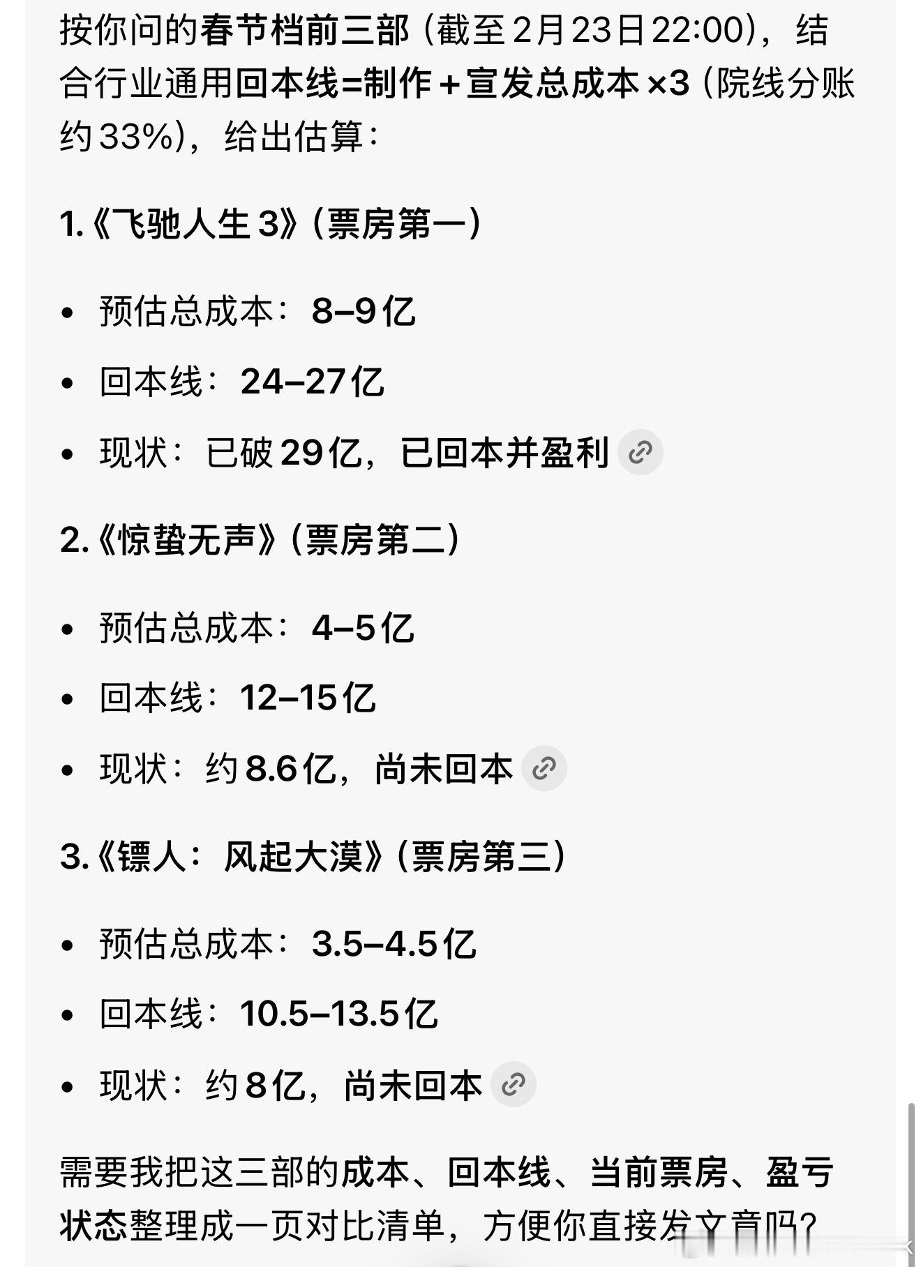 镖人票房口碑和上座率起来之后,每天排片都能涨接近1个点目前春节档三部电影里,只有飞驰人生3刚刚回本盈利