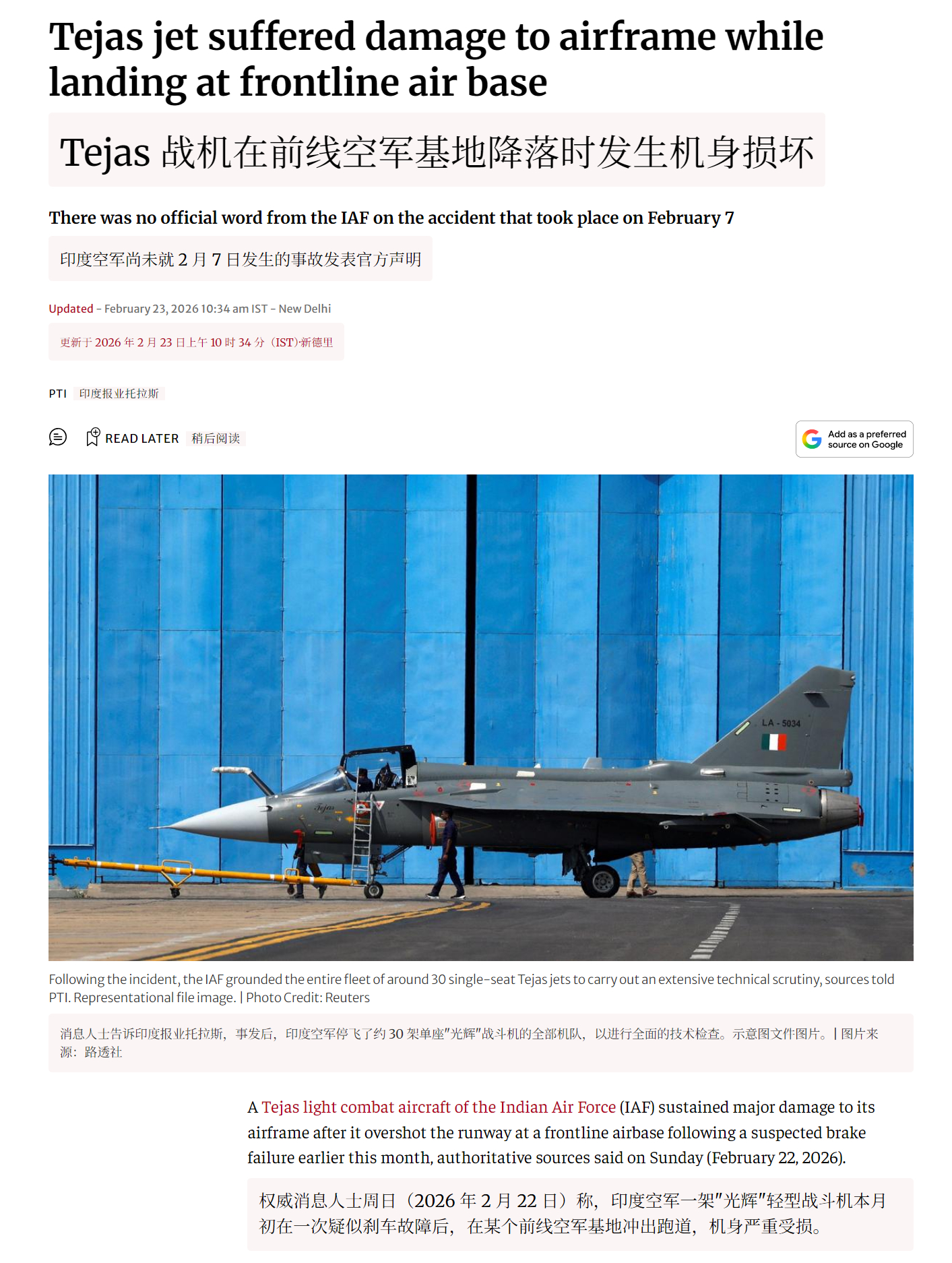 🔻2026年2月7日,一架印度空军 LCA 在印度西部前沿基地训练飞行后降落时发生事故:飞机疑似刹车故障,超速跑道并冲入泥地,导致机体严重损坏。飞行员安全弹射,无地面伤亡。🔻印度空军随后将约30-35架单座 LCA 机队全部停飞,进行全面技术检查。 🔻但是,印度斯坦航空 HAL 不承认,它说“没坠毁”,称其为“地面上的小技术事件”(minor technical incident on ground)🔻印度空军还想瞒呢,在事件发生后(2月7日)未立即发布官方声明,直到印度媒体于2月22-23日报道后,HAL才于2月23日澄清。海外新鲜事热点现场国际局势