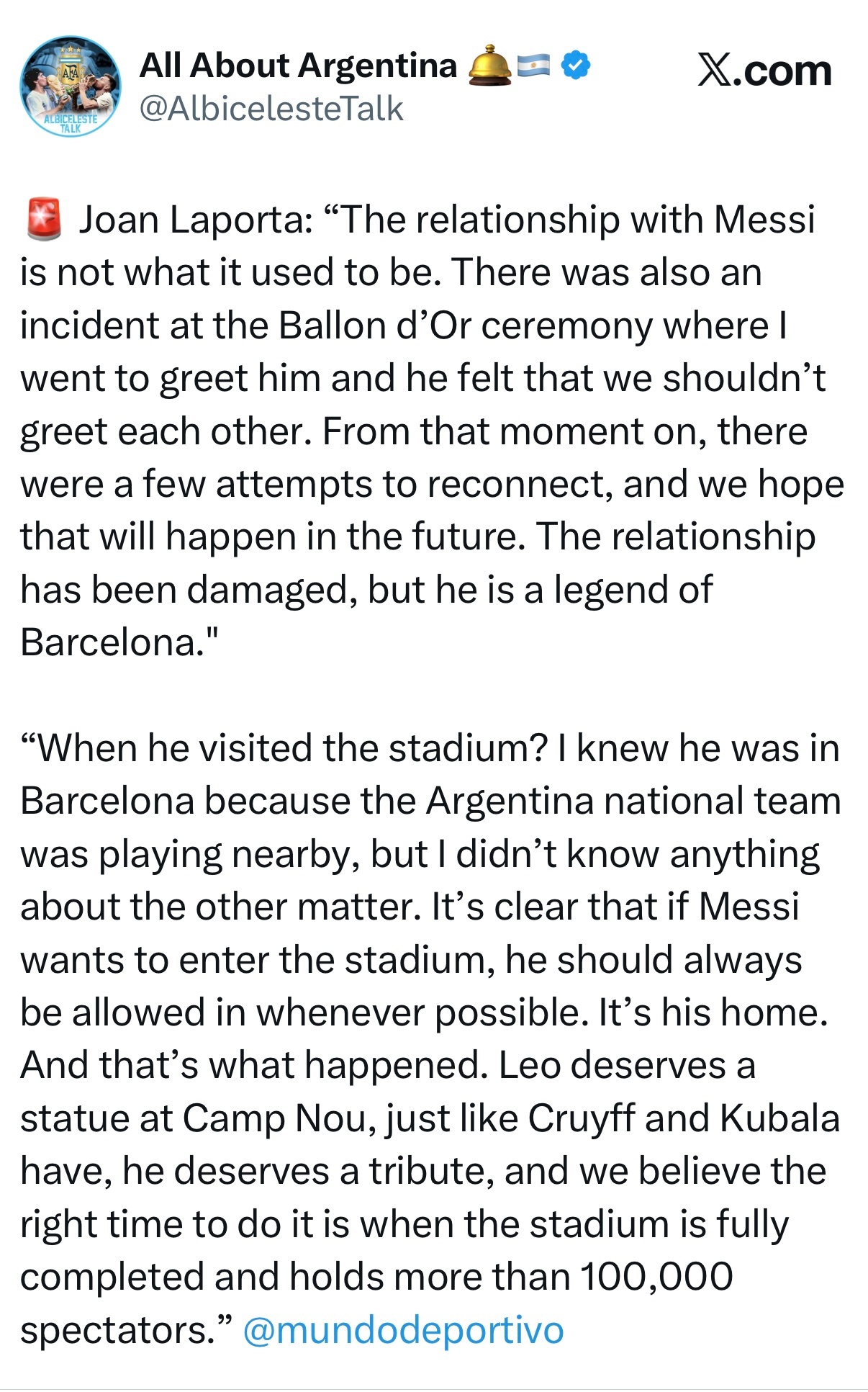 “他什么时候来过球场?我知道他当时在巴塞罗那,因为阿根廷国家队在附近比赛,但我对其他事情一无所知。很明显,如果梅西想进入球场,就应该尽可能地允许他进入。那是他的家。而事实也正是如此。梅西应该在诺坎普球场拥有一座雕像,就像克鲁伊夫和库巴拉一样,他值得被铭记,我们认为最合适的时机是在球场完全竣工,能够容纳超过10万名观众之后。”