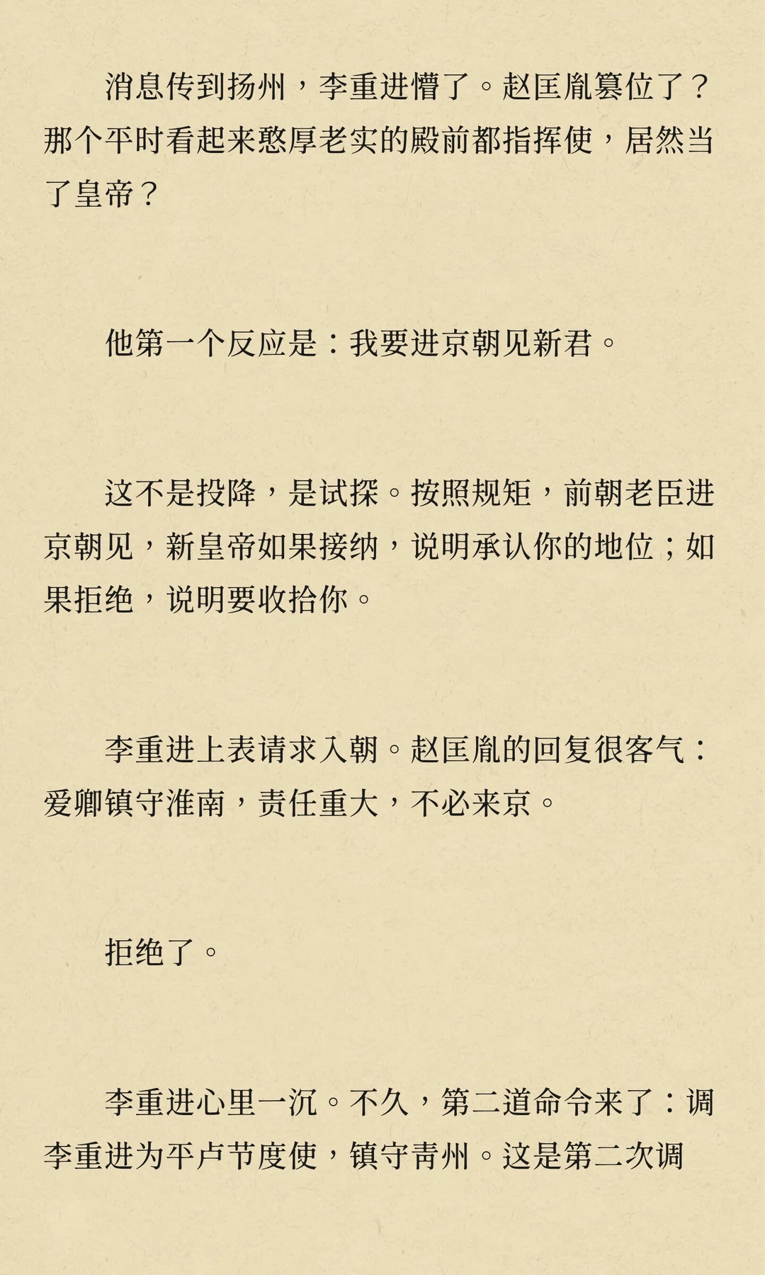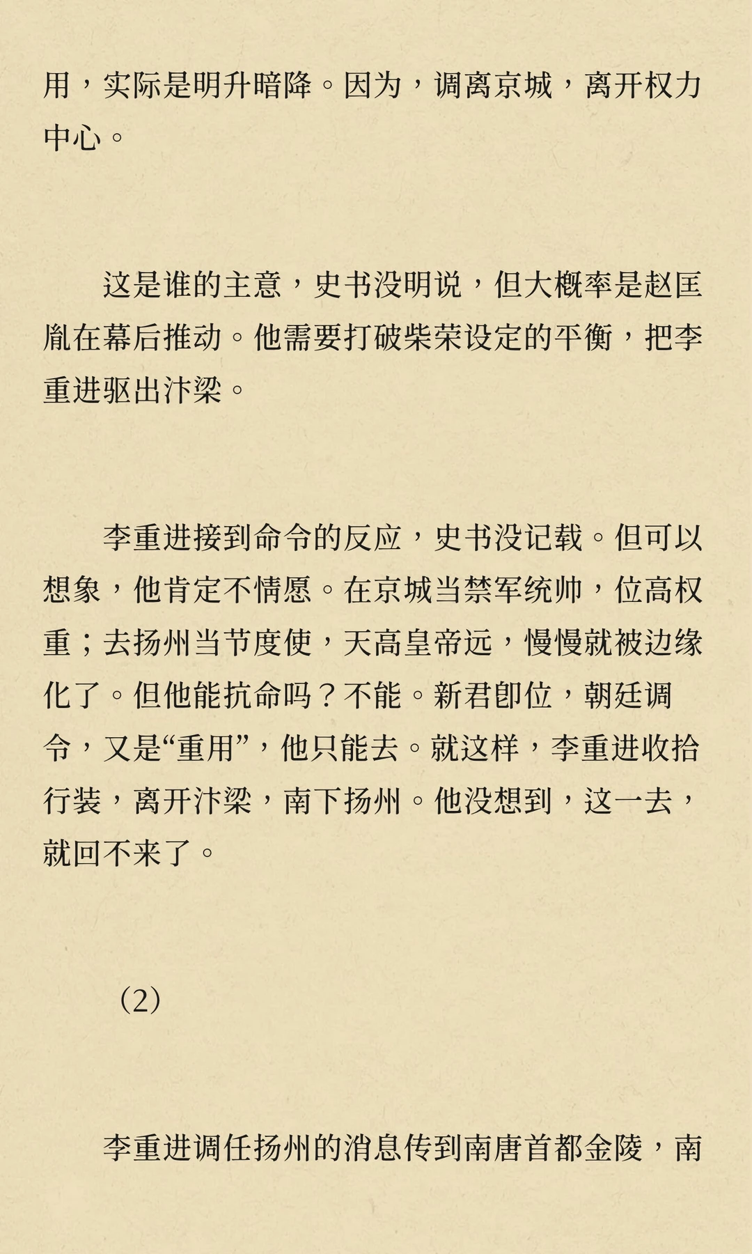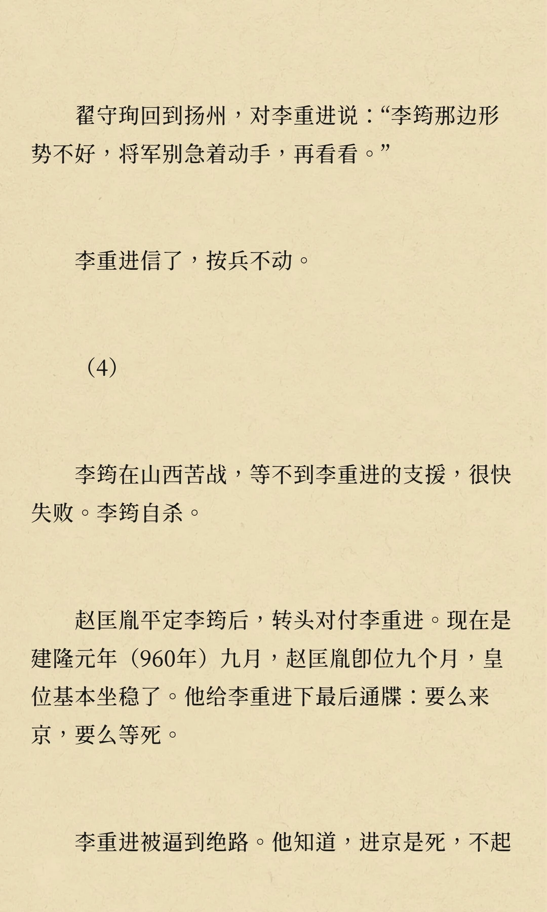 周世宗柴荣病逝,幼子柴宗训即位。赵匡胤通过调任李重进,监视等手段,逐步削弱其权力,为篡位铺路。显德七年,赵匡胤发动“陈桥兵变”,篡位称帝,建立宋朝,李重进最终在扬州兵败自焚。