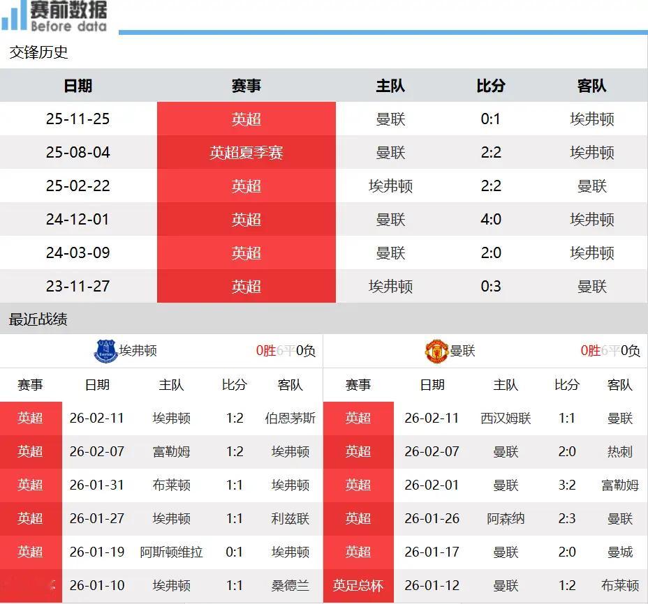 埃弗顿vs曼联前瞻:太妃糖主场硬度拉满,曼联客场攻坚遇考验北京时间2月24日凌晨4点,英超第27轮收官之战,埃弗顿坐镇主场迎战曼联。一、两队近况英超26轮战罢,埃弗顿10胜7平9负积37分位列第9;曼联12胜9平5负积45分排名第5。上轮联赛,埃弗顿主场1-2不敌伯恩茅斯,此前5轮不败的势头被终结;曼联客场1-1战平西汉姆联,联赛四连胜戛然而止。两队目前均为单线作战,没有多线赛事拖累,体能储备十分充足。二、比赛核心看点埃弗顿向来以球风硬朗著称,身体对抗能力突出,主场作战更是韧性十足,面对曼联也毫不怯场。曼联在卡里克接手后接连拿下强敌,整体表现亮眼,但球队老问题依旧明显:面对中下游球队时稳定性不足。曼联无论哪位主帅执教,都更擅长防守反击,攻坚能力始终是短板。面对强队时,对手主动压上恰好给了红魔反击空间;而面对中下游队伍,对手往往密集防守、退守不出,曼联便容易陷入苦战、意外丢分。此役埃弗顿大概率主场立足防守伺机反击,曼联想要客场轻松取胜难度极大。卡里克能否真正证明自己,关键就看曼联能否在实力相对靠后的对手身上稳定拿分,否则所谓复兴终究是空谈。三、总结综合来看,曼联客场攻坚能力不足,埃弗顿主场韧性极强,此役红魔存在丢分可能,看好埃弗顿主场不败。双方近6次交手,埃弗顿1胜2平3负,处于劣势。伤停方面:埃弗顿有格拉利什缺阵;曼联则有芒特、德里赫特、多尔古无法出战。