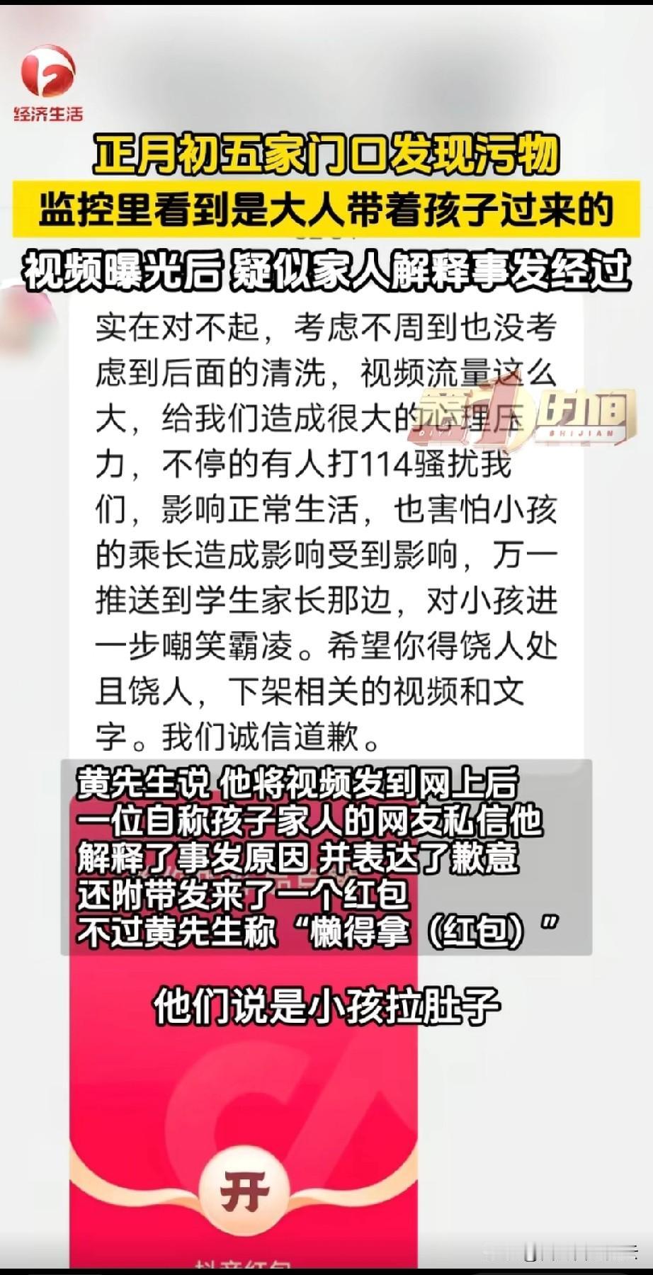 大过年的家门口发现排泄物的男子说,他发的视频在网上火了后,那家大人主动联系到他,跟他道歉了。承认是自己当初考虑不周,没有清理排泄物。 他们让男子删视频,说因为视频让他们接到很多骚扰电话,给他们的生活带来了很多不便。他们也怕这件事会牵连到孩子,孩子上学后会被网暴。 他们给男子发了个红包,一再请求男子删了视频。男子说看起来还是有点不高兴,但是也决定不再追究这件事了,他没有收红包。, 这个男子还是很善良的,听到对方说到孩子,他虽然气愤但也心软了。我能理解理解男子的心情,如果不是视频爆火,如果不是被网暴,大概他们也不会向自己道歉。 其实,小孩内急我们都可以理解,但是门口就有清洁工具,至少清理一下再走,这也是基本的做人礼貌吧。 还有大过年的,被人在家门口拉S,这摊到谁身上,也心里不爽。这是这家大人的不懂事。我就好奇,如果这件事没有上热搜,你们会道歉吗? 对于这件事,你怎么看呢?