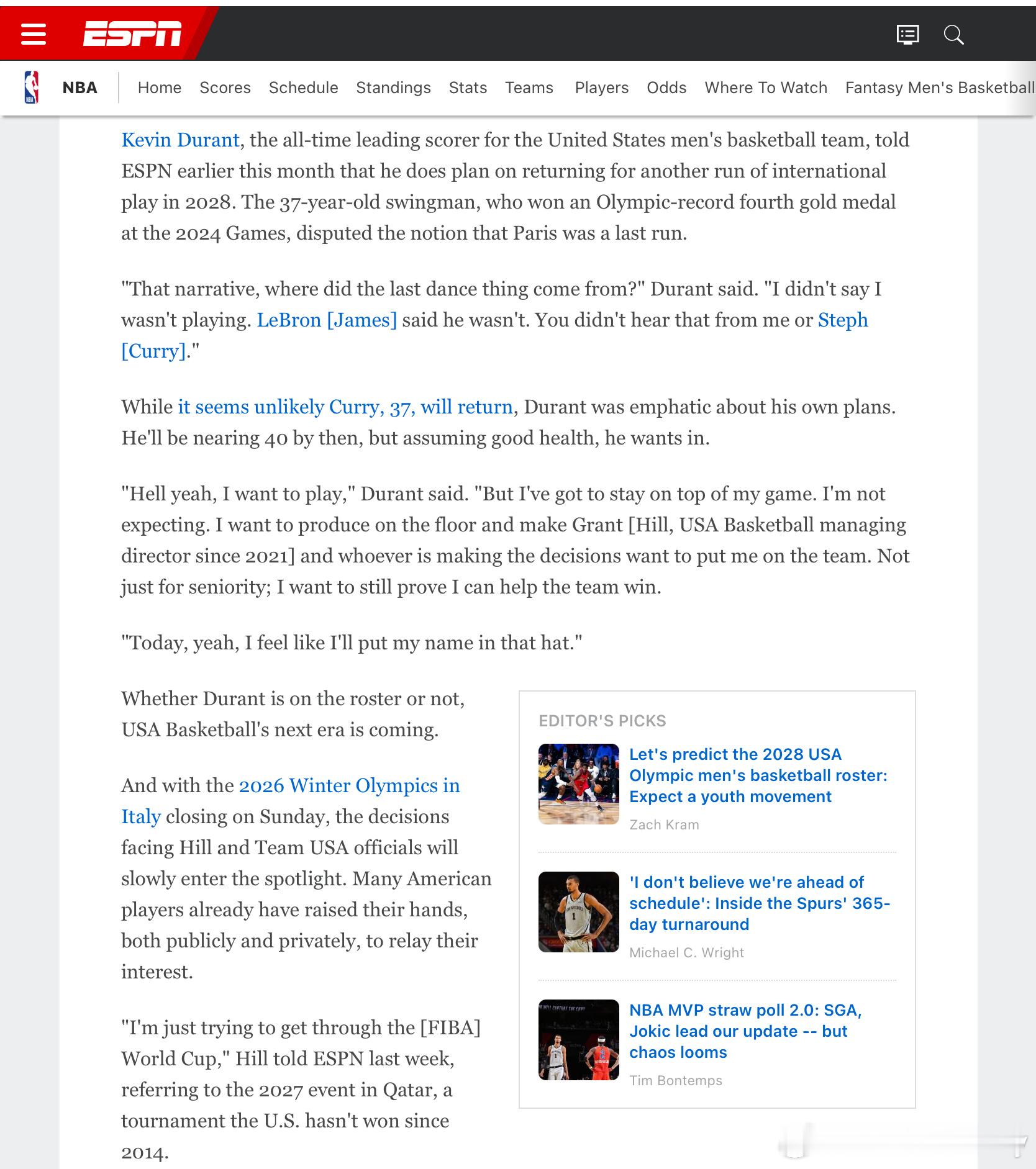 杜兰特在本月早些时候曾接受ESPN采访,否认巴黎奥运会是“最后一舞”,并表示有着非常明确的计划和态度参加2028年洛杉矶奥运会。