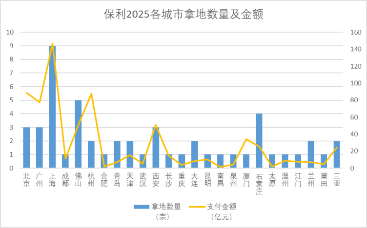 据统计数据,2025年保利在25个城市拿了52宗地,按城市能级划分,一线城市拿地金额占比达到44.9%,新一线城市占比35.5%,二线城市占比13.4%,合计占比达93.8%。
