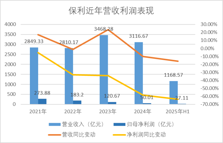 2021-2024年及2025上半年,保利分别录得总营收同比增速为17.2%、-1.4%、23.4%、-10.1%及-16.1%。可以看出,营收规模从2024年起出现较为明显的调整。