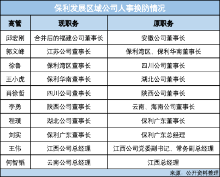 区域公司层面,保利则进行了一轮人事大换防,涉及保利湾区、保利华南、保利广东、福建公司、江西公司、四川公司等多个区域。