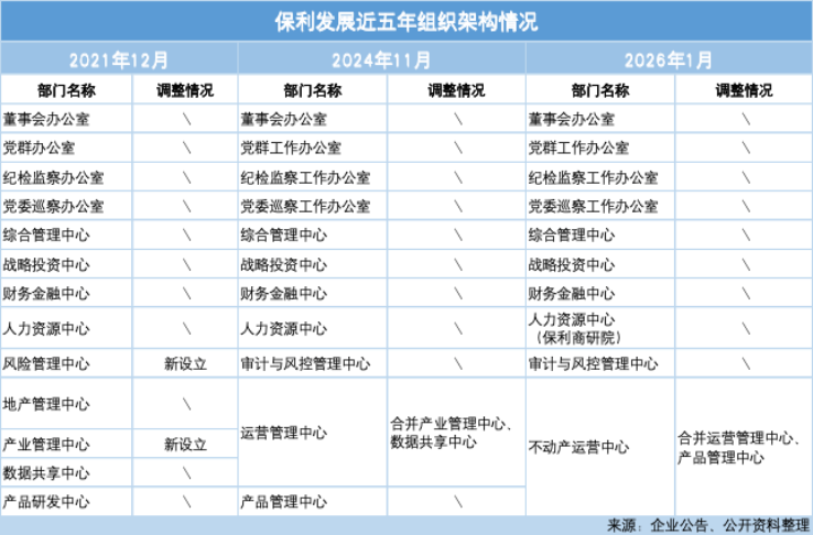 最近一次调整是在2026年1月12日,保利发布公告称,启动新一轮组织架构优化,将“运营管理中心”和“产品管理中心”合并调整为“不动产运营中心”,并由四川公司总经理严吉洁与粤中公司副总经理刘远担任该部门事业部负责人。