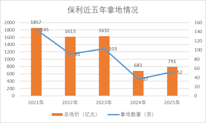 根据公开信息测算,保利2025年拿地总价约为791亿元,权益金额697.5亿元,同比增加约15.9%;拿地数量从上年的37宗升至52宗,新增计容面积达457.2万平方米,同比增加39.2%;拿地金额权益比约为88%,连续三年超过80%。