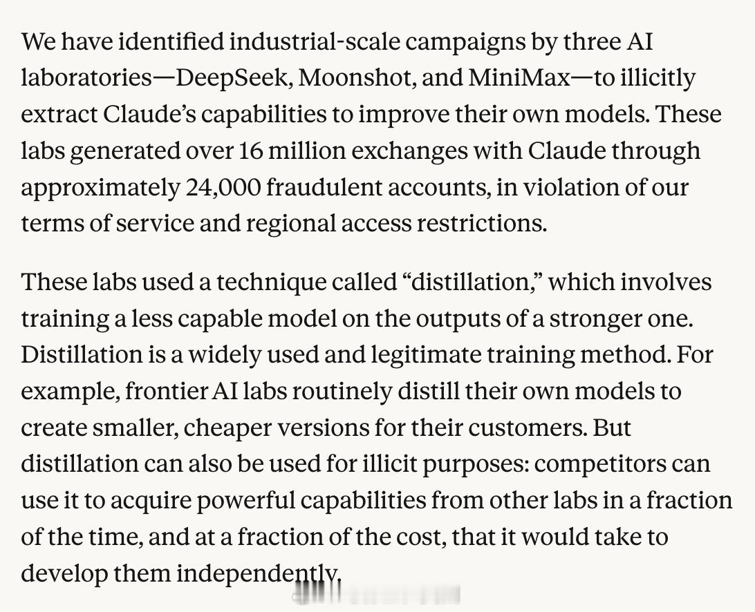 Anthropic表示,“蒸馏”本身有正当用途,例如企业可以用它来打造自家模型的轻量化版本;但这一技术也可能被用来在“极短时间内、以极低成本”开发出具有竞争力的产品。