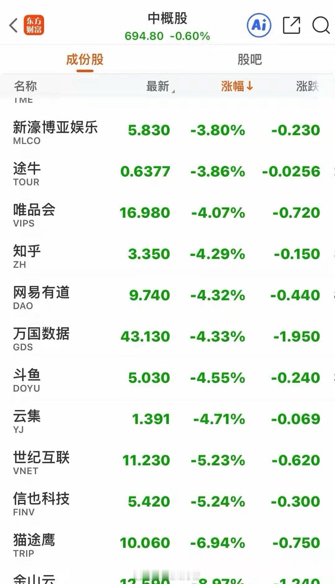 中概股指数高开低走,小幅下跌0.60%。个股分化明显:金山云跌8.97%,世纪互联跌5.23%,万国数据跌4.33%,途牛、好未来、携程等跌超3%;反之,蔚来涨4.34%,雾芯科技、理想汽车、微博、拼多多等小幅上涨。