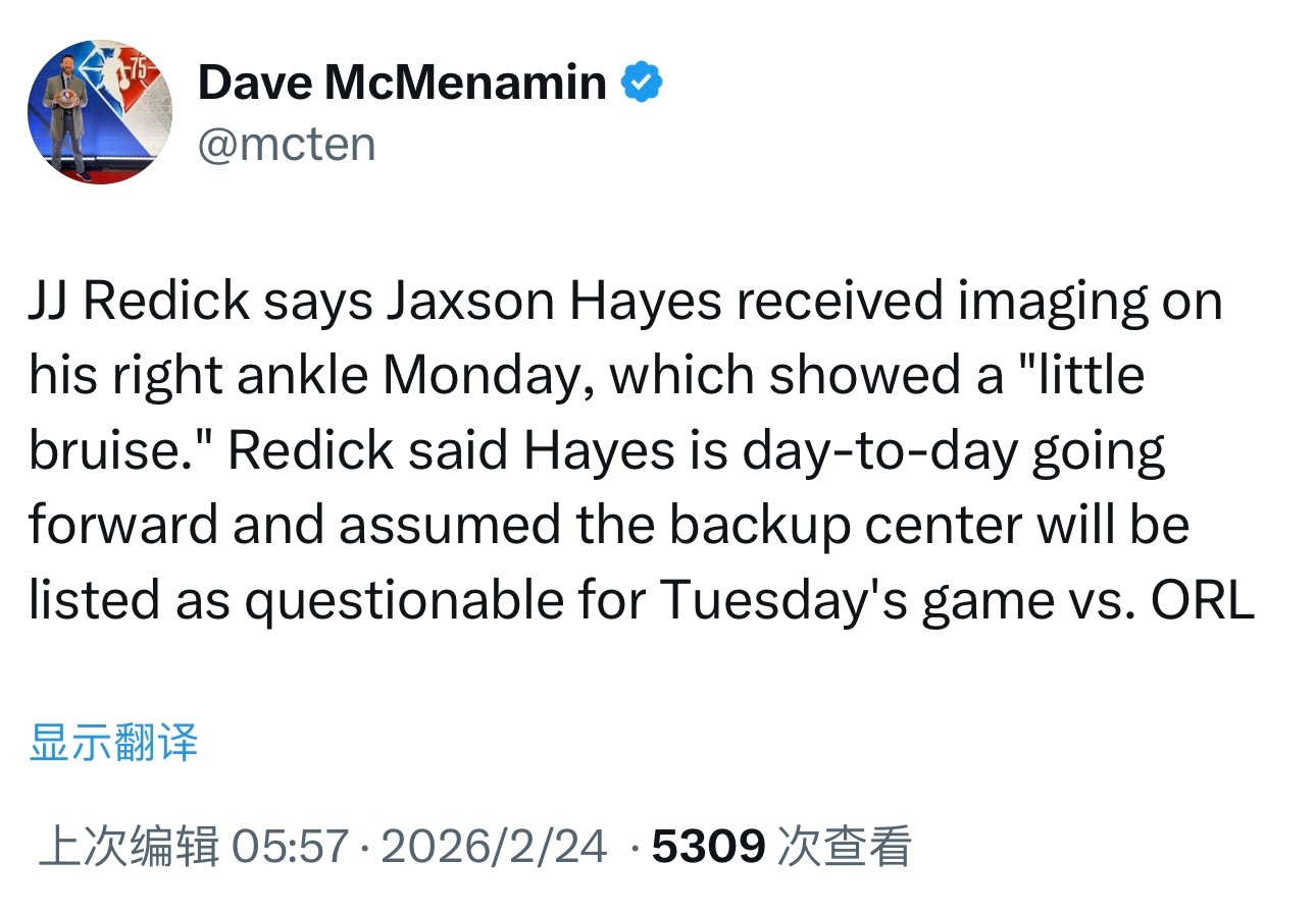 雷迪克表示,海斯接受了右脚踝影像学检查,结果显示存在“轻微瘀伤”。海斯的状态为每日观察,预计将在明天对阵魔术的比赛前被列为出战成疑状态。