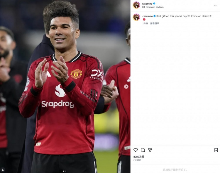 本场比赛迎来34岁生日的卡塞米罗首发出场,赛后他也在个人社媒晒出本场赛后庆祝胜利照片,配文写道:“在这个特殊日子收获最棒的礼物!曼联加油!”