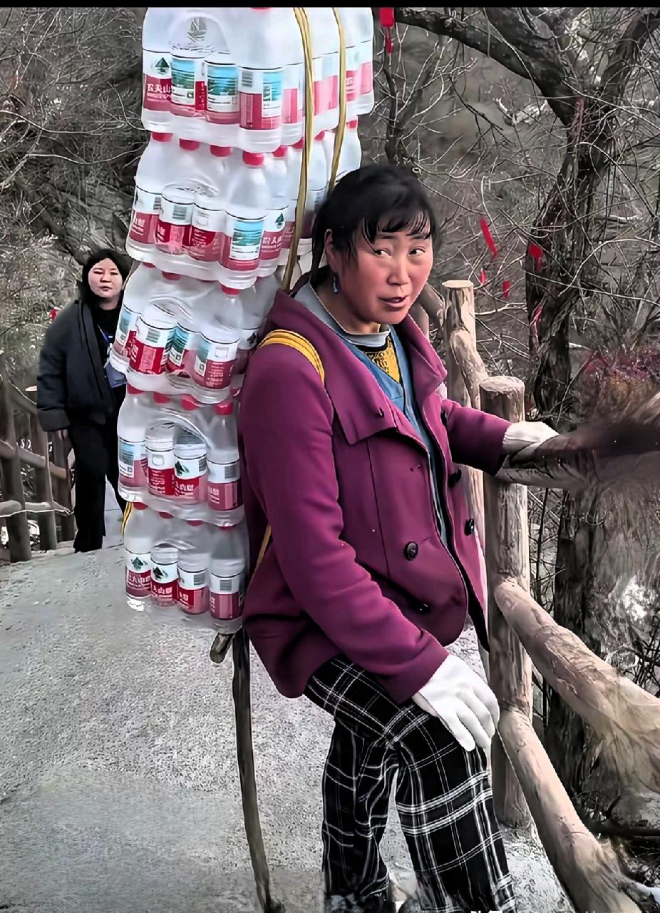 谁还能说一瓶水50元贵? 生活不易啊!看看这位大姐背上的水,一捆24瓶,五捆120瓶,就是一百二十斤,男人背着也得吭哧吭哧,就是空身上山也累的不轻,何况是背上一百多斤的东西。 靠山吃山,靠水吃水,靠自己的血汗挣钱,谁都不容易,既然是有钱游山玩水,那就不要抱怨靠人工背山上的水贵不贵!