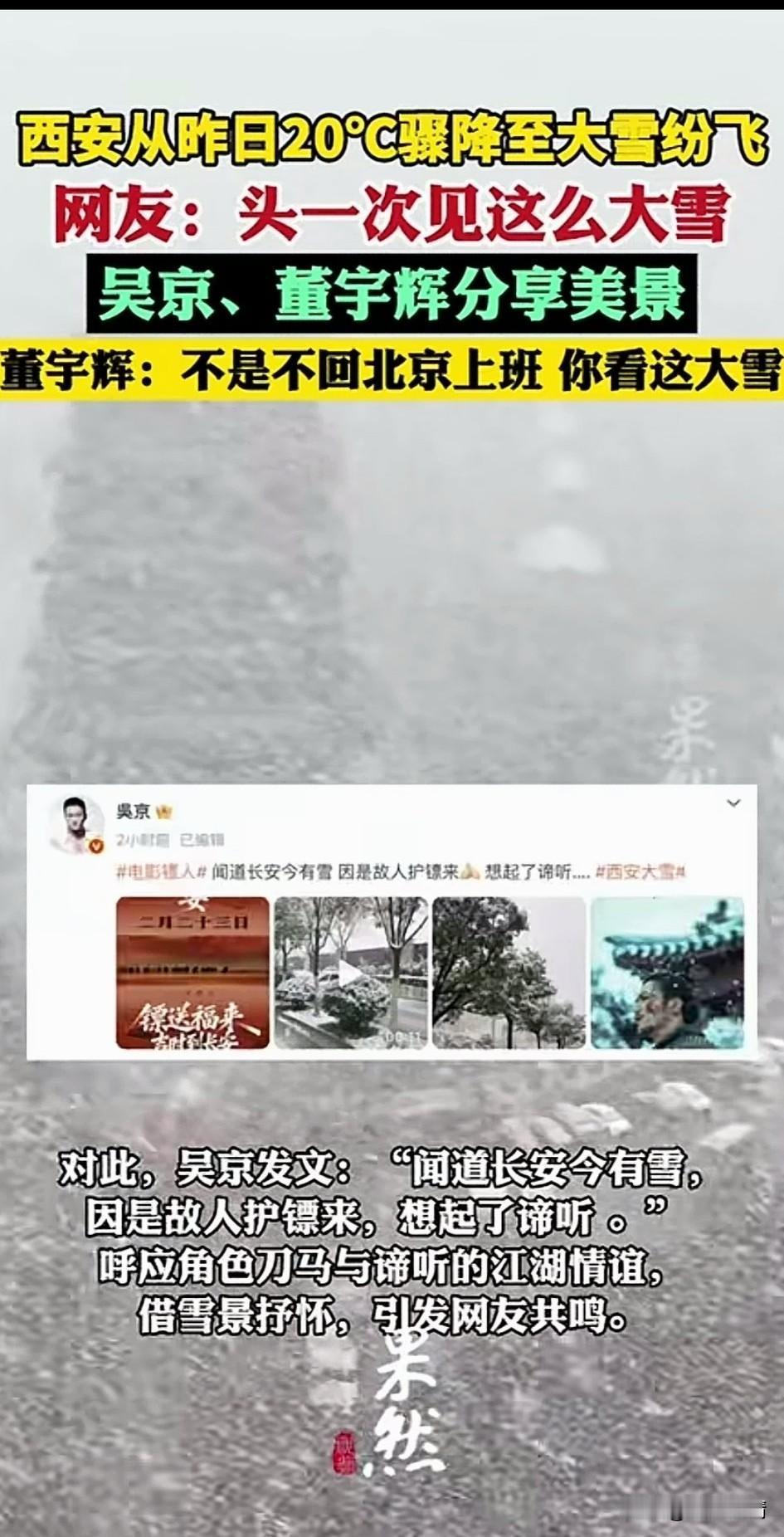 近日西安的一场大雪, 直接让西安登上了热搜, 大雪之下的古城西安, 简直美极了, 走在大雪纷纷的古城街道, 就像穿越的回了大唐盛世, 银装素裹的西安更有味了, 就连吴京也发文庆贺, 做了一首与他电影标人相关的诗, 董宇辉也忍不住发 文, 是不想回北京上班,你看这大雪, 此情此景真的是穿一套古装, 走在这样的大街上, 拍一组美美的雪天美照, 足可惊艳一世了, 为什么西安下一场大雪就能上热搜? 那是因为古城配大雪, 颇有一番意境, 这独属于中国式的浪漫, 只有中国人才能看得懂! 大家觉得西安下大雪好看吗? 西安 西安瓢泼大雪 西安首场雪 西安冻雪 西安春节打卡地 西安雪景照