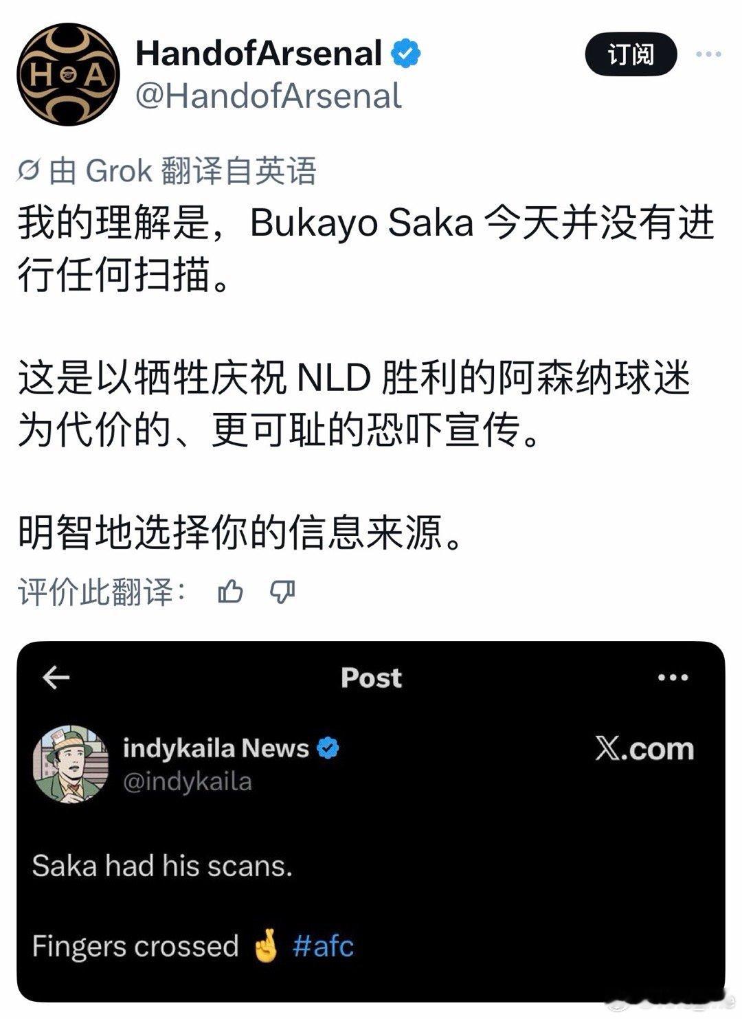 HandofArsenal辟谣萨卡“扫描”的消息。很早就屏蔽了这位绿帽哥,国内体