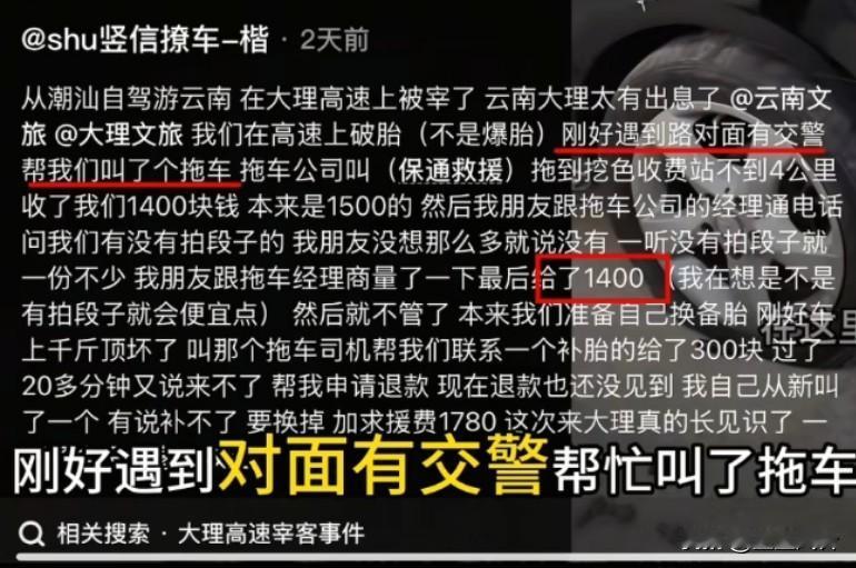 男子云南旅游,遇高速爆胎,拖车4公里要价1400元,换胎需1780元,称“这钱花