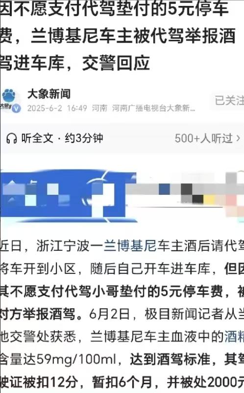 浙江宁波,一男子是代驾,半夜11点半接到订单,对方喝多,车是兰博基尼,值几百万,男子看车贵重,怕有事赔不起,要他另请高明,车主态度诚恳,求男子将车开回小区,会另给小费,男子勉强答应,车出酒店,要交5元停车费,车主要男子代交,到小区和代驾费一起支付,谁知到了小区,车主要男子下车,非要自己开进车库,既不给小费,也不给停车费,还把男子拉黑,男子被耍,一气之下报警,举报车主酒驾,车主悲剧了! 这件事发生在宁波深夜,代驾师傅姓石,白天有正经工作,晚上跑代驾补贴家用。 他接到订单赶到酒店门口,看到兰博基尼时,心里直接打了退堂鼓。 几百万的车,随便刮蹭一下,他几个月的辛苦钱都不够赔。 车主三十多岁,浑身酒气,站都站不稳。 他反复恳求石师傅帮忙,还承诺到家后额外给小费。 石师傅心一软,想着出门在外都不容易,就硬着头皮接了这单。 车子驶出酒店,岗亭要收5元停车费。 车主让石师傅先垫付,说到小区一起结算。 石师傅没多想,掏出手机付了这5块钱。 一路小心驾驶,平安把车送到小区门口。 石师傅准备把车开进车库,完成订单。 车主却突然变了脸,让他赶紧下车。 车主抢过钥匙,说自己能开进车库。 石师傅提醒他还没结代驾费、没给停车费,更没兑现小费。 车主不理不睬,直接上车关门,一脚油门开进了地库。 石师傅当场愣住,心里又气又委屈。 他打电话过去,发现已经被拉黑。 5块钱不多,可被人这样耍弄,换谁都咽不下这口气。 石师傅没有胡搅蛮缠,也没有上门闹事。 他选择报警,如实说明情况,举报车主酒后开车进车库。 民警很快赶到现场,调取监控,上门找到车主。 酒精检测结果显示,车主体内酒精含量59mg/100ml,属于酒驾。 监控清晰拍到车主从代驾手里拿钥匙,自行驾车进入车库。 铁证面前,车主再也没法抵赖。 最终车主被记12分,驾驶证暂扣6个月,还要面临2000元以下罚款。 为了赖掉5元停车费,付出这么大的代价,实在得不偿失。 事后车主补了费用,还想打赏8元圆场,可教训已经无法挽回。 开得起几百万豪车,却在5块钱上斤斤计较。 这种反差,让人看清什么是真正的格局。 有钱不等于有教养,豪车撑不起缺失的人品。 很多人觉得,喝点酒挪个车不算事。 哪怕只是进小区车库,只要车辆启动、移动,就属于驾驶行为。 酒后心存侥幸,最后只会栽在自己的疏忽里。 代驾师傅起早贪黑,赚的都是辛苦钱。 每一分钱都靠汗水换来,不该被这样随意轻视。 尊重底层劳动者,是做人最基本的底线。 这件事也给所有喝酒的人提了醒。 叫了代驾,就要全程信任配合,别自作主张碰方向盘。 别因为一时好面子、贪小便宜,把自己推入麻烦里。 人与人之间的信任,往往藏在小事里。 一句承诺、一次守信,看似不起眼,却能守住人心。 丢掉诚信,再贵的车,也开不出体面的人生。 出门在外,多一份体谅,少一份算计。 尊重别人的劳动,守住自己的底线,比什么都重要。 别让小聪明,毁了自己的一生。 各位读者你们怎么看?欢迎在评论区讨论。