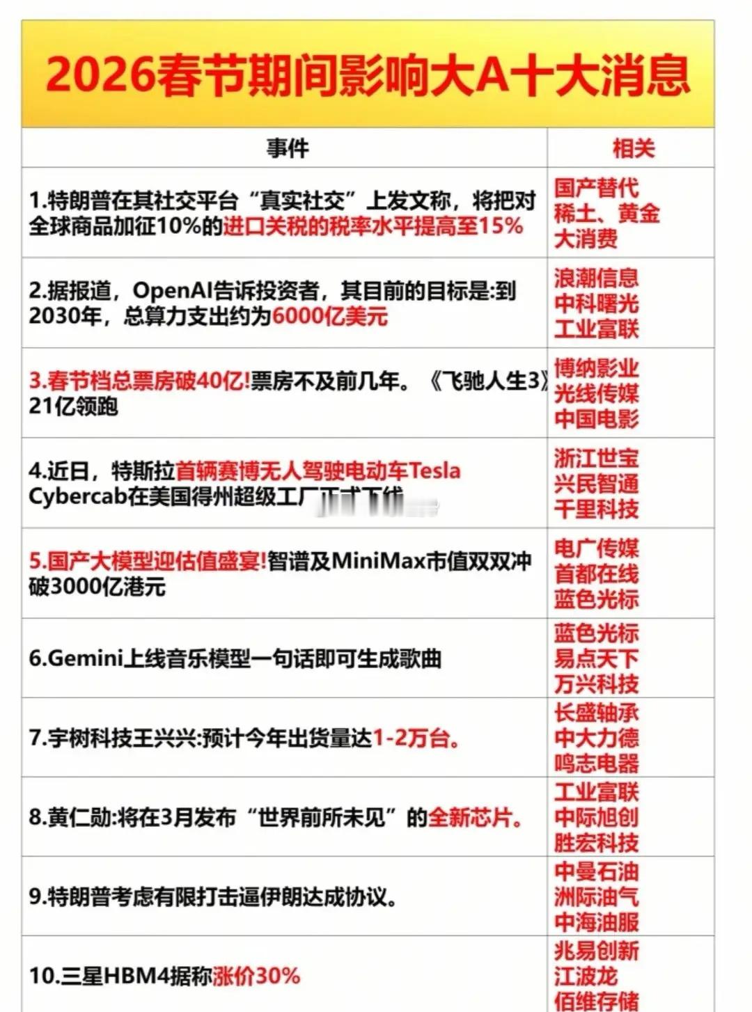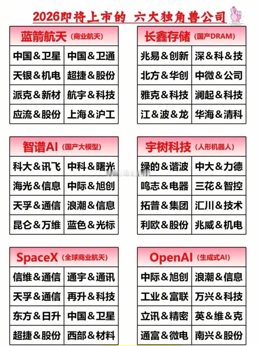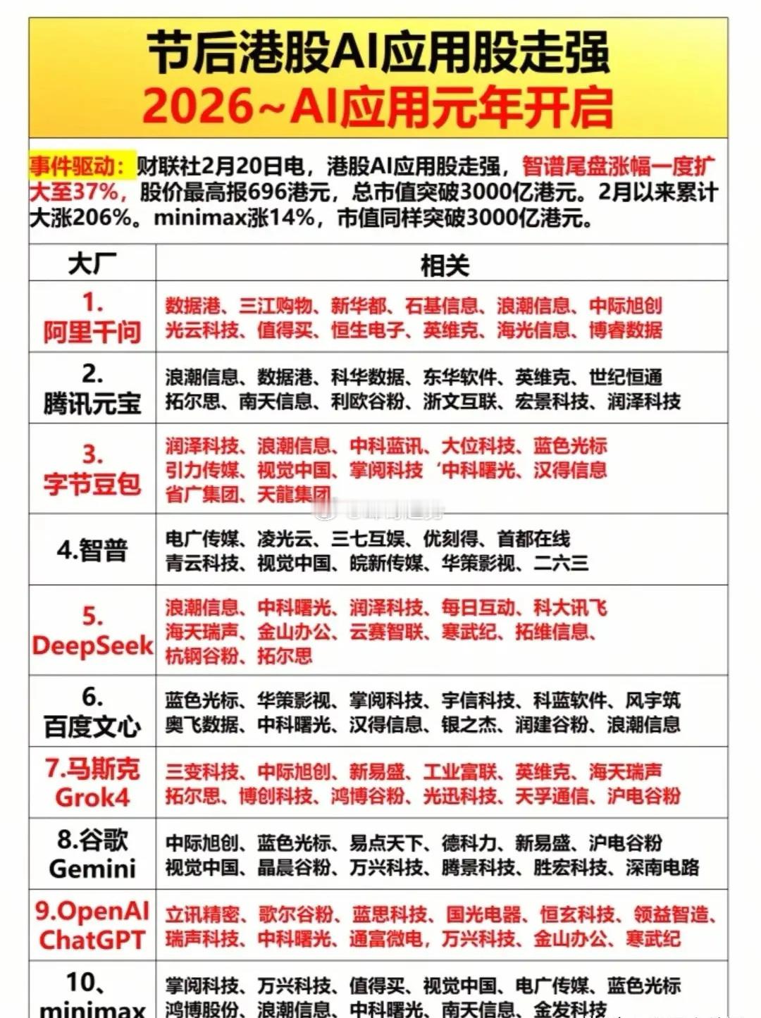 2026科技大年!春节假期A股人气榜+八大核心赛道全梳理!(开盘必读)(1)春节假期A股人气榜出炉,24只热门股强势霸屏,从智算中心、人形机器人到AI应用,各路资金节前精准锁仓,连板龙头频出!(2)节后八大核心赛道细分龙头名单出炉:人形机器人、AI应用、存储芯片等主线清晰,龙一、中军、前排、趋势股一目了然,节后行情方向已现!(3)提前埋伏科技独角兽,蓝箭航天、长鑫存储、智谱AI等六大独角兽即将上市,相关概念股名单已整理完毕,节后科技行情主线已锁定!(4)港股AI应用股走强,2026 AI应用元年开启。AI应用成为节后市场核心主线,相关概念股有望持续受益于行业爆发式增长。重点关注智谱AI、豆包AI、阿里AI等等。