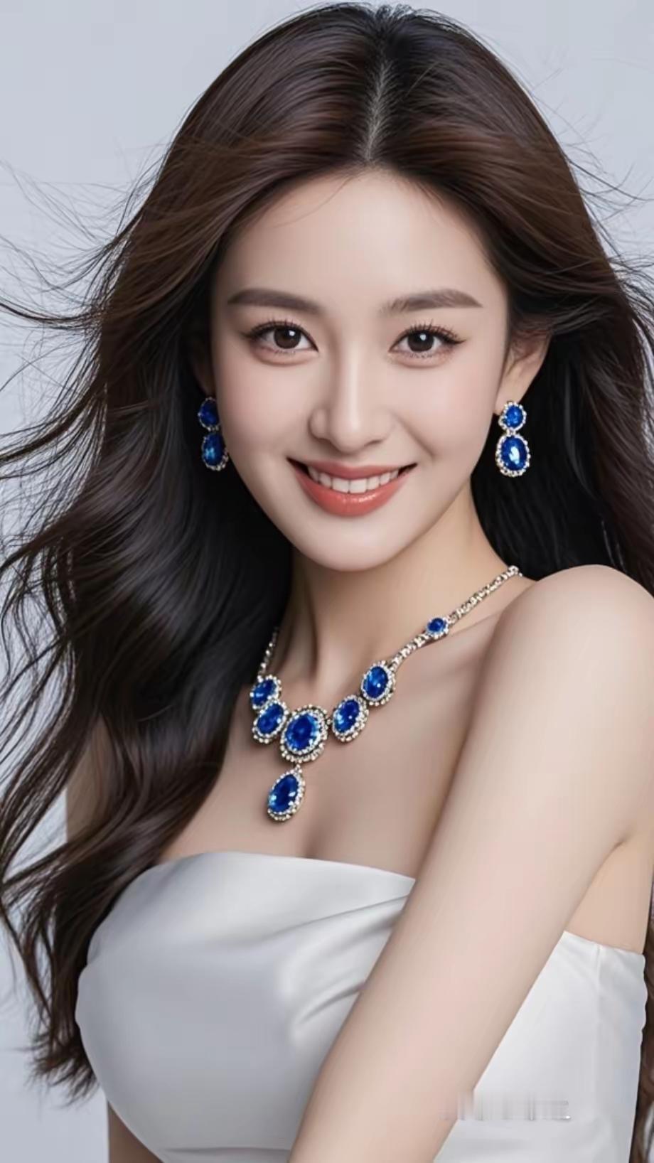 九帧同绘白衫雅仙。乌黑深棕发垂落漾柔光,白露肩毛衣衬雪肌。钻石项链耳环耀华彩,深