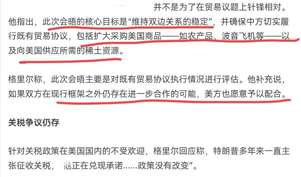 美国紧急踩了刹车!特朗普刚宣布将关税从10%提高至15%之后,美国很快对我们进行了喊话!2月22日,美国贸易代表格里尔表示,预计4月举行的中美会晤,并不是为了在贸易议题上针锋相对。   最近美国在贸易上的操作,简直跟变脸一样快,普通老百姓看着都懵。   特朗普二话不说就把关税从10%涨到了15%,消息一出来,不管是美国本土企业,还是咱们国内相关商家,都感到震惊。   没人能想到,这位美国前总统会这么贸然行事,完全没考虑后果。   其实这事儿早有苗头,之前美国最高法院就裁定,特朗普之前加关税的法律依据不合法,等于直接否定了他的政策。   换别人可能会先稳一稳,可特朗普偏不,立马换了个法律依据,接着加码关税,一副硬刚到底的架势。   他这一操作,首先炸锅的就是美国自己人。   上千家美国企业直接起诉,要求政府退还之前征收的关税,就连美国12个州都站出来反对,民主党议员也直言这是胡闹。   大家都清楚,加关税看似针对别人,最后埋单的还是美国企业和老百姓。   咱们国家也没惯着,外交部和商务部很快就表了态,明确反对这种单边加关税的做法,说贸易战没有赢家,还敦促美国赶紧纠正错误。   咱们的立场很实在,不想打但也不怕打,要是真想谈,就得拿出诚意,别一边施压一边装样子。   更有意思的是,特朗普刚把关税涨上去没一天,美国就变了口气。   贸易代表格里尔公开喊话,说4月份的中美会晤,不是来跟咱们对着干的。   这前后反差也太大了,明眼人都能看出来,美国这是硬气不下去,紧急踩了刹车。   没人会真以为美国是良心发现,核心原因就一个——他们离不开咱们中国市场。   这些年中美贸易往来越来越深,2024年两国货物贸易额都快7000亿美元了,美国很多企业在华赚得盆满钵满,离开中国市场,他们根本撑不住。   就说美国的苹果、高通这些大公司,中国都是他们最重要的市场之一,还有很多美国农场主,他们的农产品大多都出口到中国。   要是真跟咱们闹僵了,这些企业和农场主第一个得破产,美国的经济也会跟着受重创。   特朗普之所以贸然加关税,说白了就是为了自己的竞选承诺,想靠强硬姿态拉选票。   可他忘了,贸易不是儿戏,不是靠嘴硬就能解决问题的。   美国国内的反对声越来越大,企业施压、民众不满,他根本扛不住这种压力。   美国这波反复横跳,其实暴露了他们的无奈。   表面上装得很强硬,实则心里比谁都清楚,离不开中国这个大市场。   咱们中国现在的实力摆在这,不是随便就能拿捏的,不管是贸易还是其他领域,咱们都有足够的底气。   很多人可能会担心,会不会真的打贸易战?其实不用太担心,美国自己都扛不住对抗的代价。   他们这次喊话,就是想找个台阶下,想通过会晤缓和关系,既保住自己的面子,又能继续从中国市场获利。   咱们普通人看懂这一点就够了:国家强大了,说话才有底气,咱们的利益才能得到保障。   美国的反复无常,恰恰说明他们离不开咱们,也说明中美合作才是唯一的出路。   没必要被他们的强硬姿态吓到,咱们稳扎稳打,做好自己的事就好。   大国相处,从来都不是靠对抗,合作共赢才是王道。   美国终会明白,单边主义走不远,依赖中国市场不是丢脸的事,而是顺应趋势的选择。   咱们始终保持开放包容的心态,不惹事但也不怕事,未来一定会越来越好。   依附从来换不来尊重,对等合作才能行稳致远;美国的刹车,不是妥协,是认清现实的必然,而中国的底气,是自身强大的最好证明。